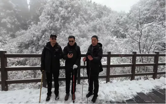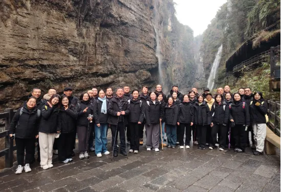 行程次站,团队抵达被誉为“地质奇观”的恩施大峡谷。恰逢天赐瑞雪,群峰尽披银装,玉树琼枝,恍若仙境。云龙地缝在素雪掩映下,幽深愈显,静谧非凡。团队成员踏雪而行,一步一景,逸趣横生。董事长支大佐先生与同仁驻足雪岭之巅,面对苍茫云海、巍巍雪山,豪情共诵《沁园春·雪》。“北国风光,千里冰封,万里雪飘……”雄浑词句与天地壮景交响,激荡起全体成员攻坚克难、勇攀高峰的凌云壮志。山路逶迤,相互扶持的身影是最温暖的风景;寒风凛冽,回荡山谷的欢声笑语是最动人的乐章。