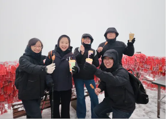 行程压轴,团队造访“天下无双圣境”老君山。天公再度作美,洒落琼芳。但见雾凇沆砀,琉璃世界,整座山峦宛如雕琢的仙境。大家无畏严寒,踏雪攀岩,沿蜿蜒山道彼此鼓舞、接力前行。登顶时刻,云开雾散,金顶沐阳,璀璨日光倾泻于皑皑雪原,映照在每张汗珠与笑容交织的脸庞上。这份共抵巅峰的喜悦与自豪,正是方正人“同心致远,勇攀高峰”精神内核的极致体现。下山后,围坐品尝糊涂面、红焖羊肉等地道暖膳,食物驱散严寒,情谊沁润心田,为这段冰雪奇缘画上了一个温馨而圆满的句点。