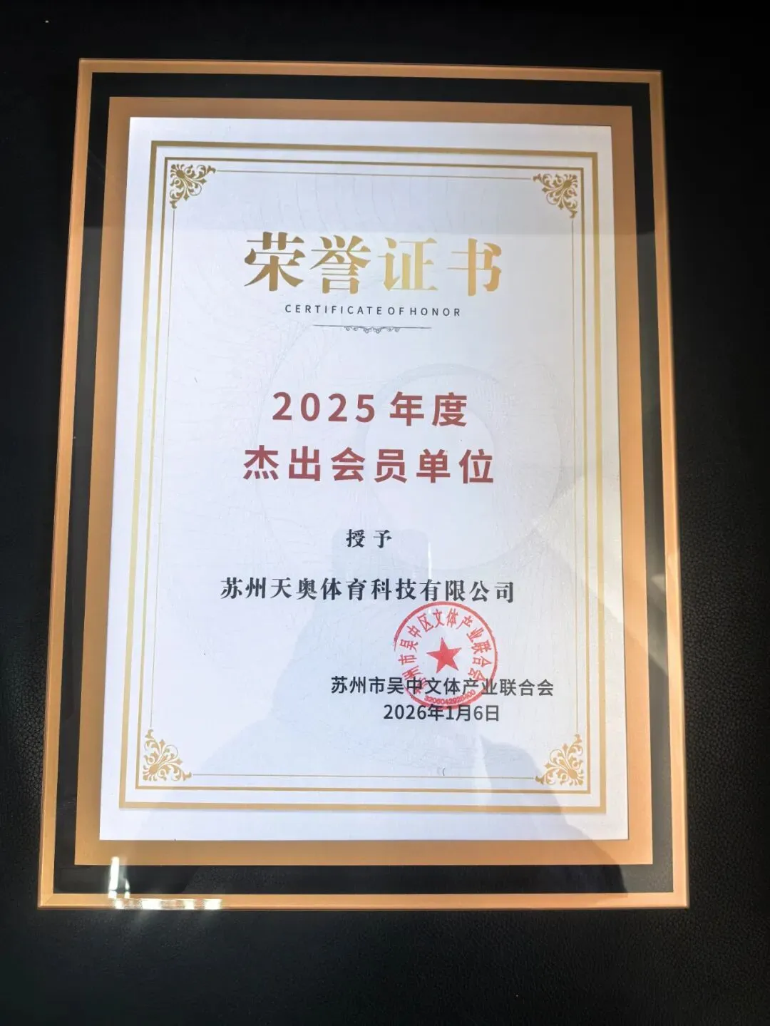 热烈祝贺天奥体育集团荣获苏州市吴中区文体产业联合会“2025年度杰出会员单位”荣誉称号