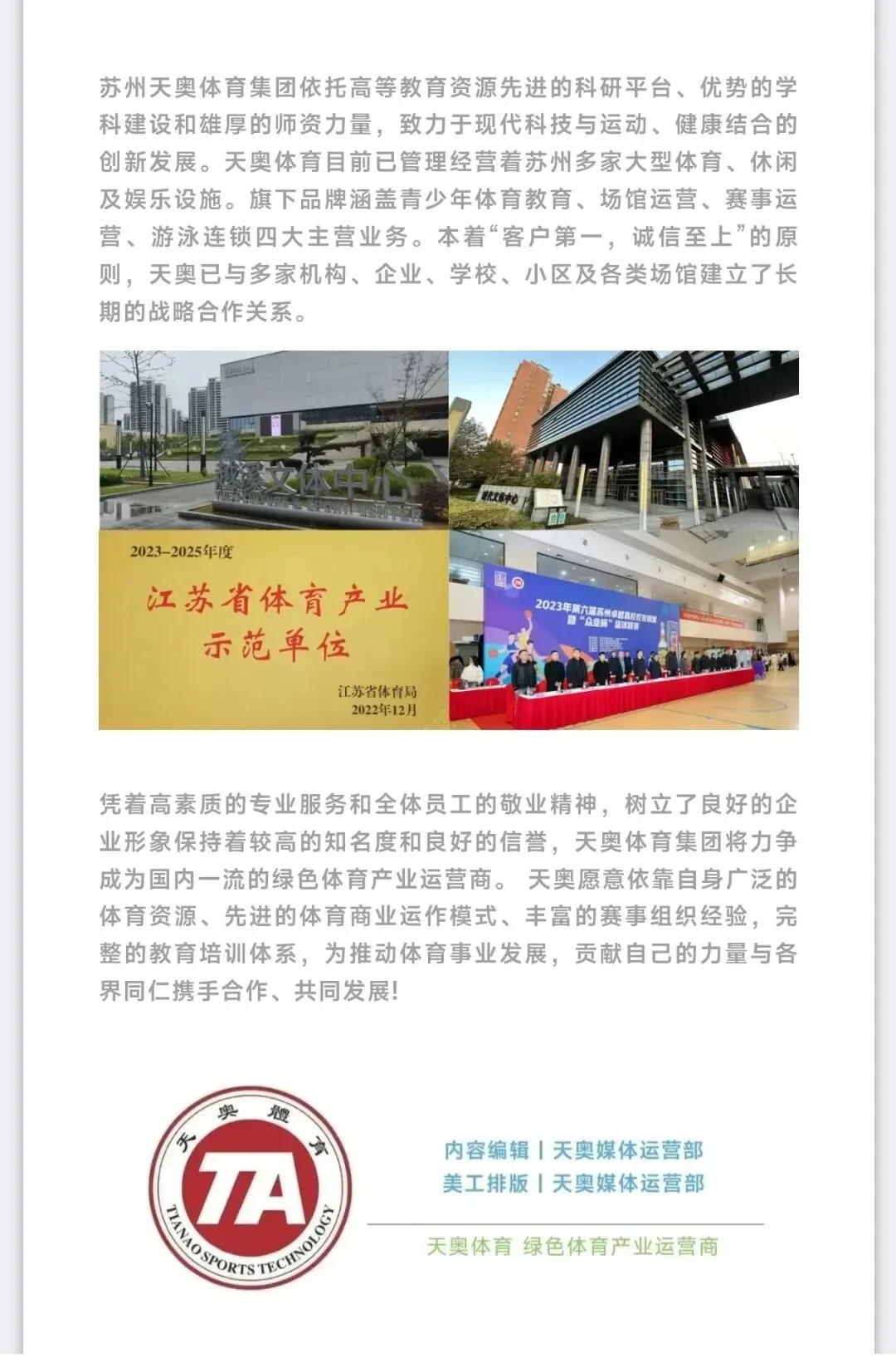 纵观2025年,天奥体育一如既往地支持苏州市吴中区文体事业的发展,深耕体育行业,凭借深厚的行业积淀和良好的社会声誉,长期积极支持并参与协会建设与发展,从各级大众体育联赛、各类企事业单位赛事的承办、卓盟系列体育赛事的丰富发展到TAB青少年篮球公开赛的赛事IP持续运营,天奥体育以实际行动响应吴中文体联的号召,始终在各项工作中踊跃建言、务实奉献,被吴中文体联评价为“推动行业进步、凝聚会员力量的重要标杆”。2026年,天奥体育将以现有项目为基础,整合优化文体旅资源配置,推动苏州市吴中区文体旅产业向好向上发展。
