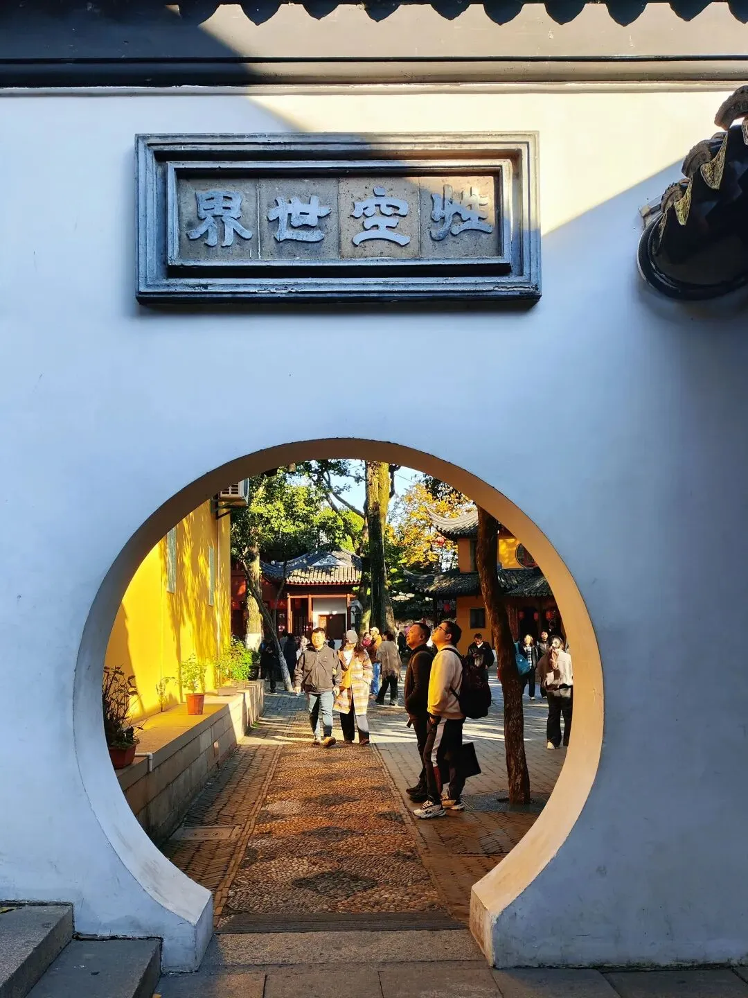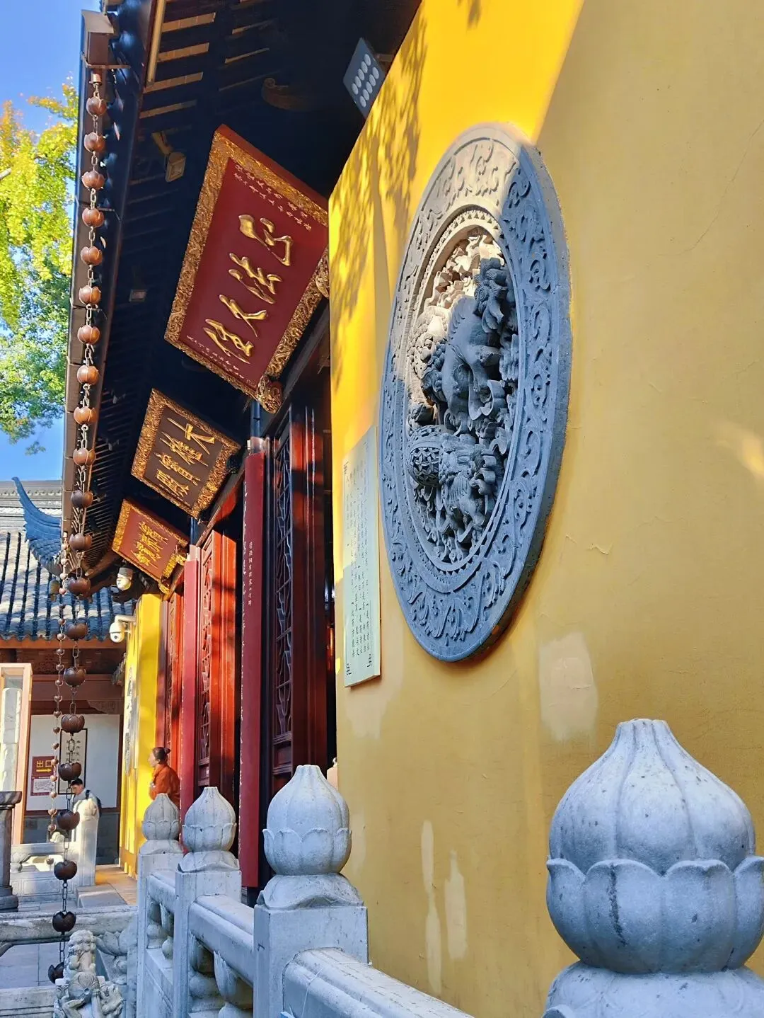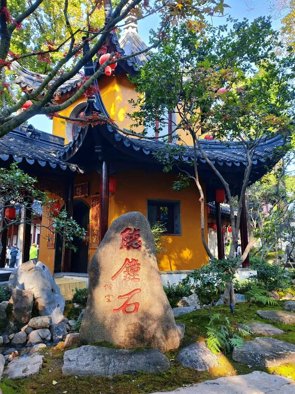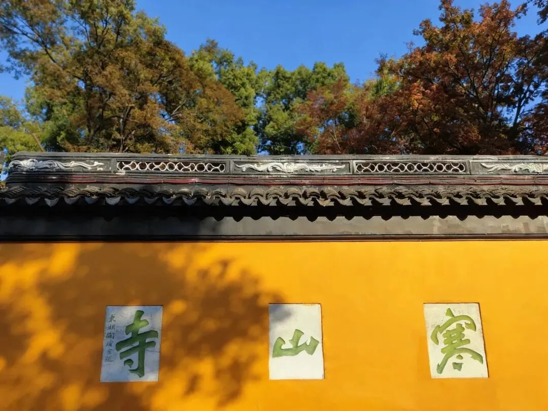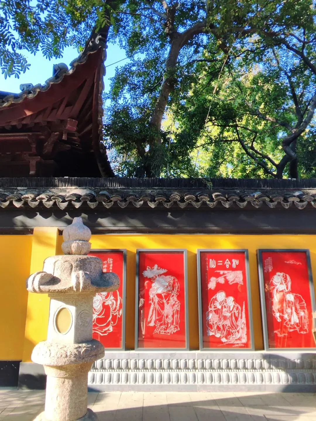 游览寒山寺一般是从西门进东门出。从西门踏入的瞬间,市井的喧嚣便被明黄色的照壁隔绝在外。门口“寒山寺”三个字一定记得要拍照打卡,明黄色墙面是苏州特有的观音土调蛋清涂刷的,阳光下泛着温润的光,“寒山寺”三个字为绿字魏碑体,挺括有力,随手一拍都是自带禅意滤镜的大片。