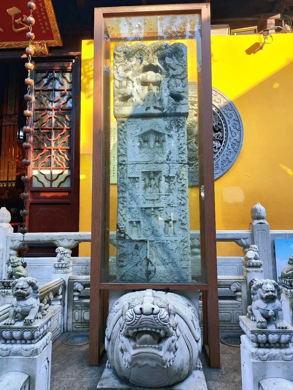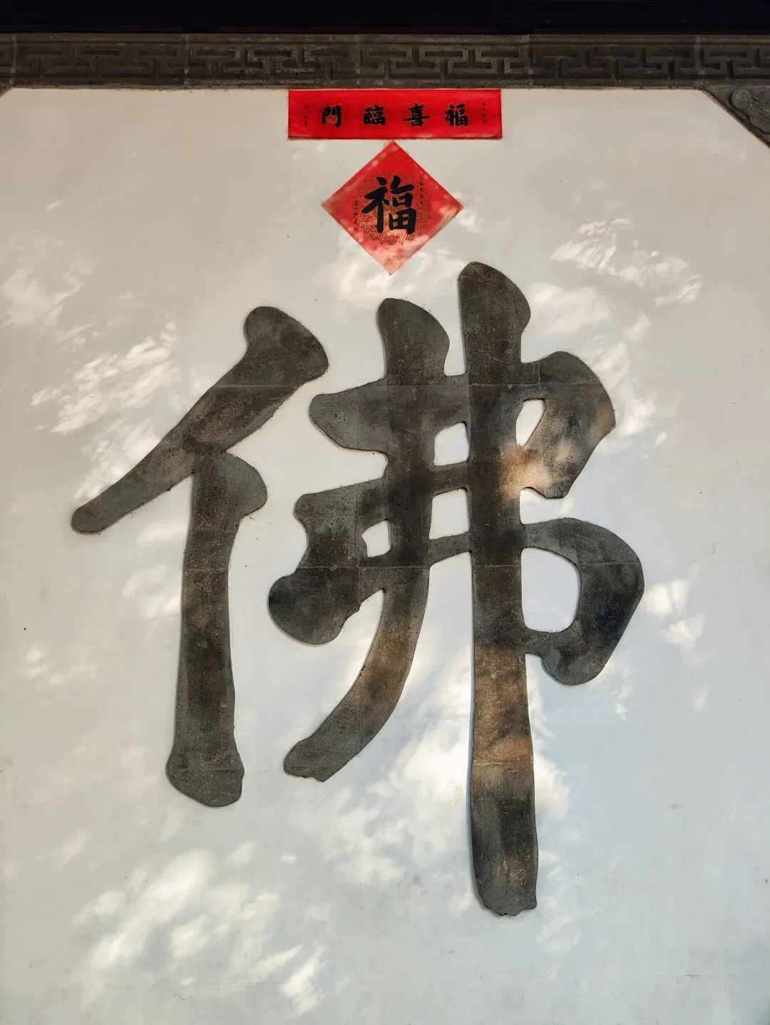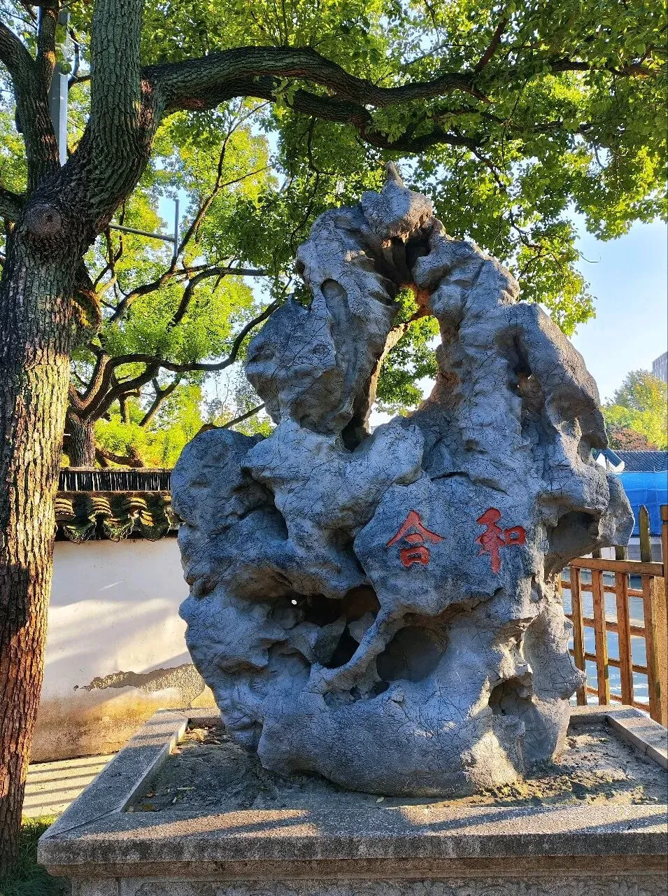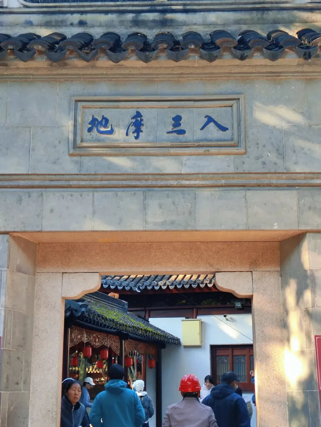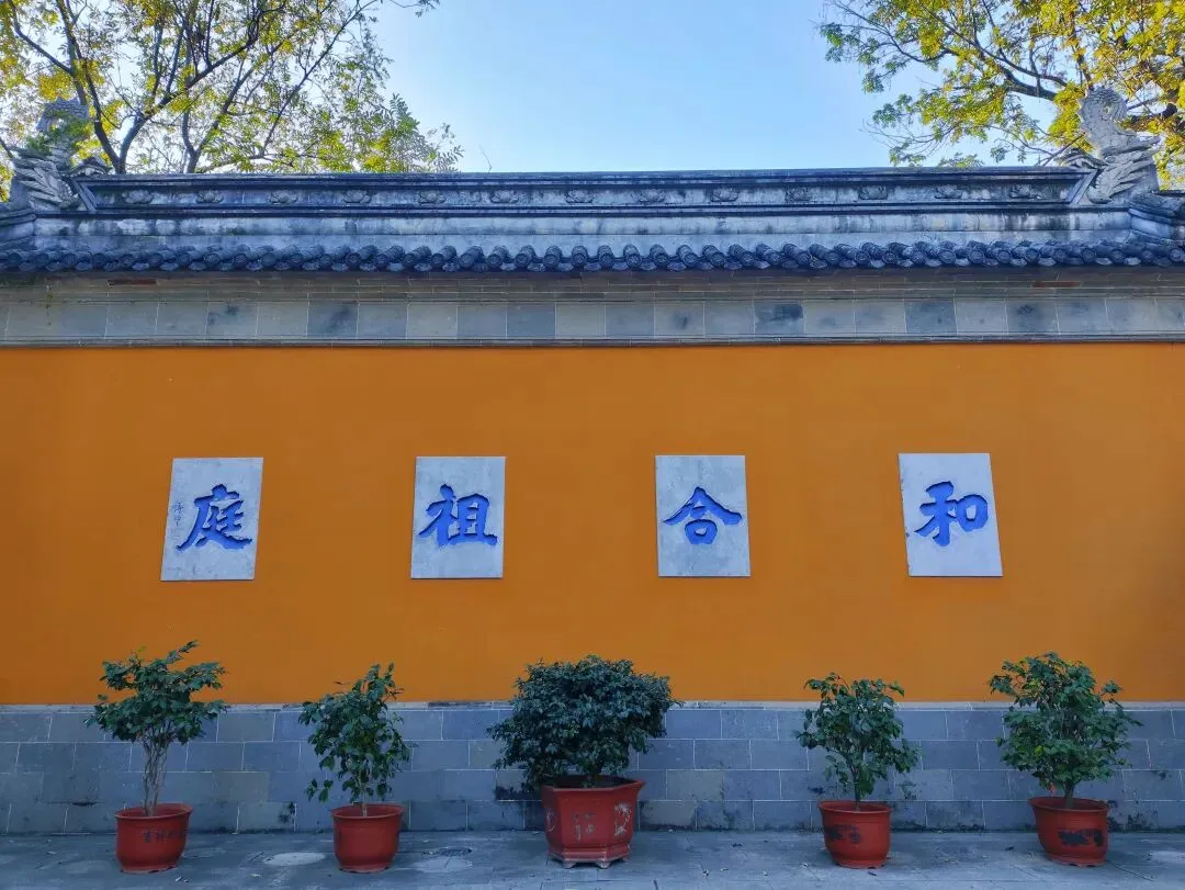 游览寒山寺一般是从西门进东门出。从西门踏入的瞬间,市井的喧嚣便被明黄色的照壁隔绝在外。门口“寒山寺”三个字一定记得要拍照打卡,明黄色墙面是苏州特有的观音土调蛋清涂刷的,阳光下泛着温润的光,“寒山寺”三个字为绿字魏碑体,挺括有力,随手一拍都是自带禅意滤镜的大片。