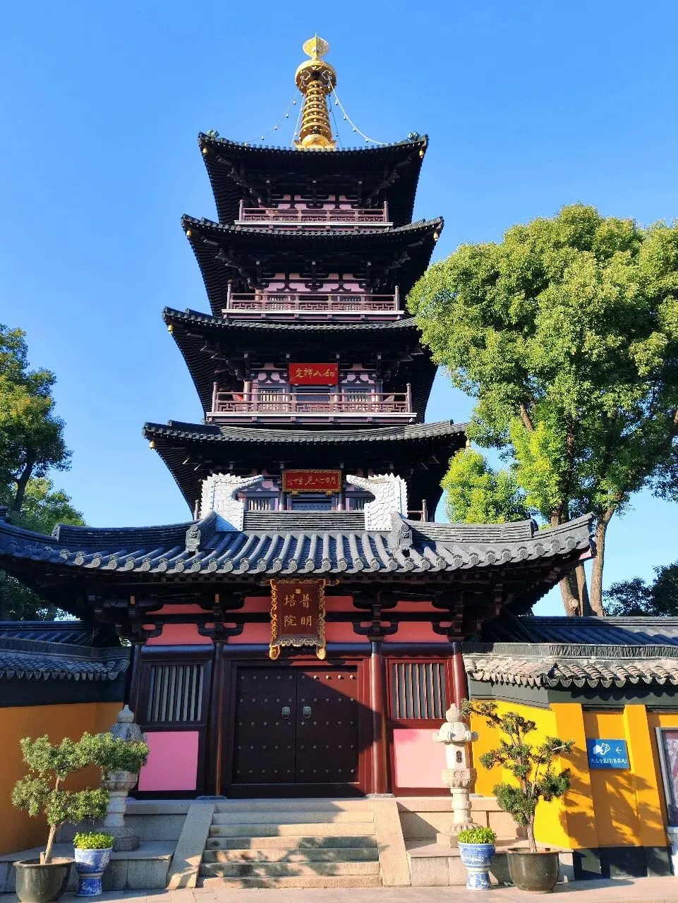 寒拾殿的后面便是普明宝塔,是寒山寺的标志性建筑。普明宝塔始建于南朝梁天监年间,与寒山寺同岁,初名妙利普明塔院。历史上,宝塔三建三毁,直到1993年重建,1996年建成后,才结束了寒山寺600多年有寺无塔的历史。