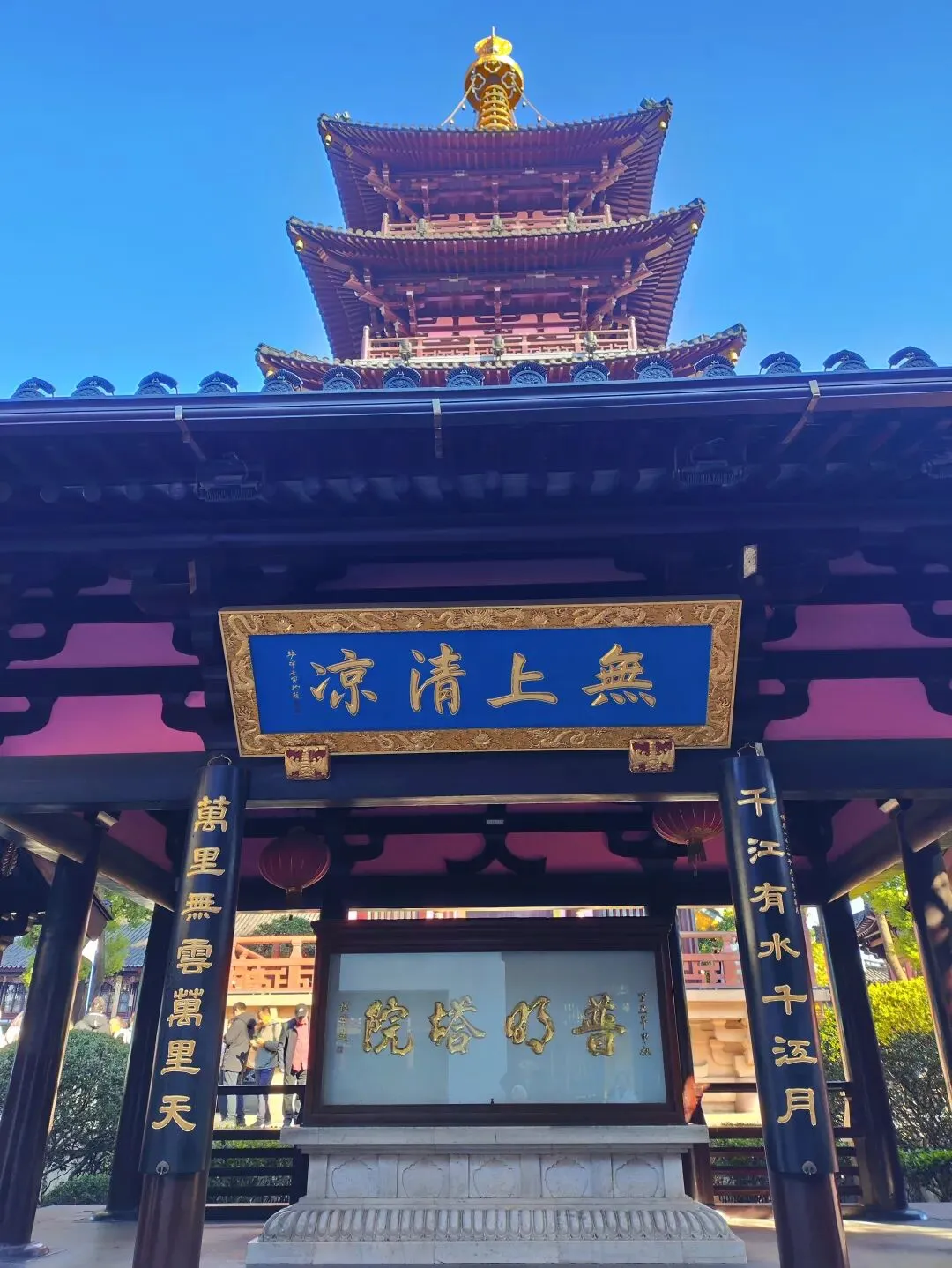 普明宝塔为仿唐五级四面楼阁式方塔高42.2米,是寒山寺的制高点,由台座、塔身和塔刹三部分组成,飞檐翘角,完美再现了唐代庄重华丽的建筑风格。登塔拾级而上,每层都能看到不同的景致:二层俯瞰古寺全貌,黄墙黑瓦错落有致;四层能望见远处的京杭大运河,像一条银色丝带蜿蜒流淌;顶层则可将枫桥、铁岭关尽收眼底,江南水乡的温婉与古关的雄浑在此交融。