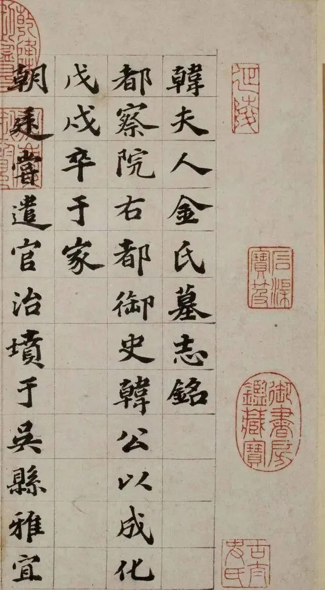 《韩夫人墓志铭》的署款 “嘉议大夫、吏部右侍郎、前史官里人吴宽撰”,以及钤印 “原博”,引首印 “延陵”“古太史氏”,都彰显了作品的权威性与传承性。而 “乾隆御览之宝”“嘉庆御览之宝”“石渠宝笈”“御书房鉴藏宝” 等皇家鉴藏印,更是印证了此作在历史长河中的显赫地位,历经岁月而光彩不减。