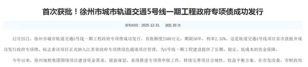 ...................................................................................因为,就在近日,这条地铁获得了首批2500万元的支持。...................................................................................2025年12月25日,徐州市城市轨道交通5号线一期工程政府专项债成功发行,首批额度2500万元,期限30年,利率2.35%。