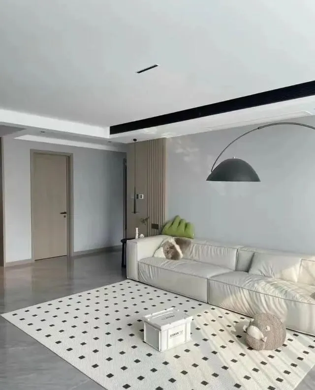 沙发选的乳白色皮质款 , 好打理 , 脏了一擦就行。 没放茶几!这点我觉得很聪明 , 客厅一下子就宽敞了 , 小孩跑来跑去也不怕磕碰。