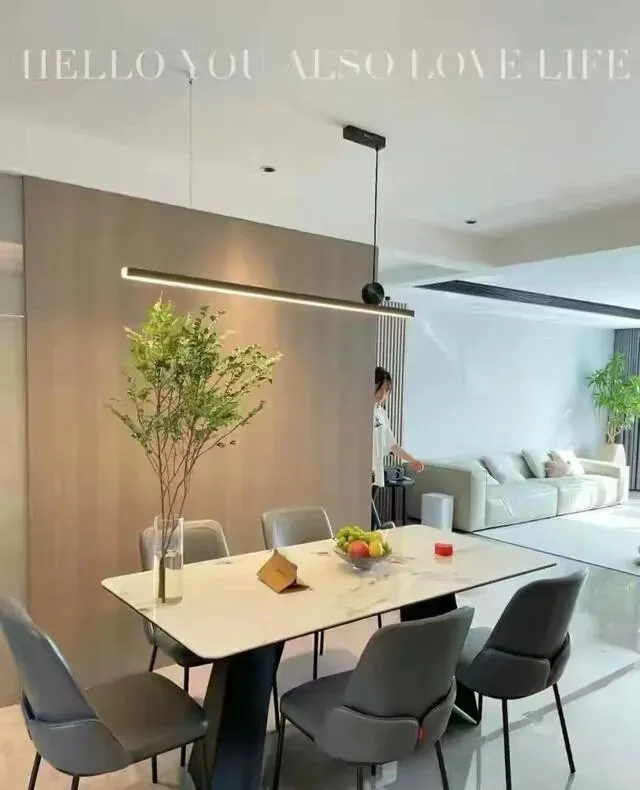餐桌选的长条形 , 白色面板配原木腿 , 来客人多也不怕坐不下。 桌上摆了一盆绿植 , 点睛之笔 , 整个空间都鲜活了。