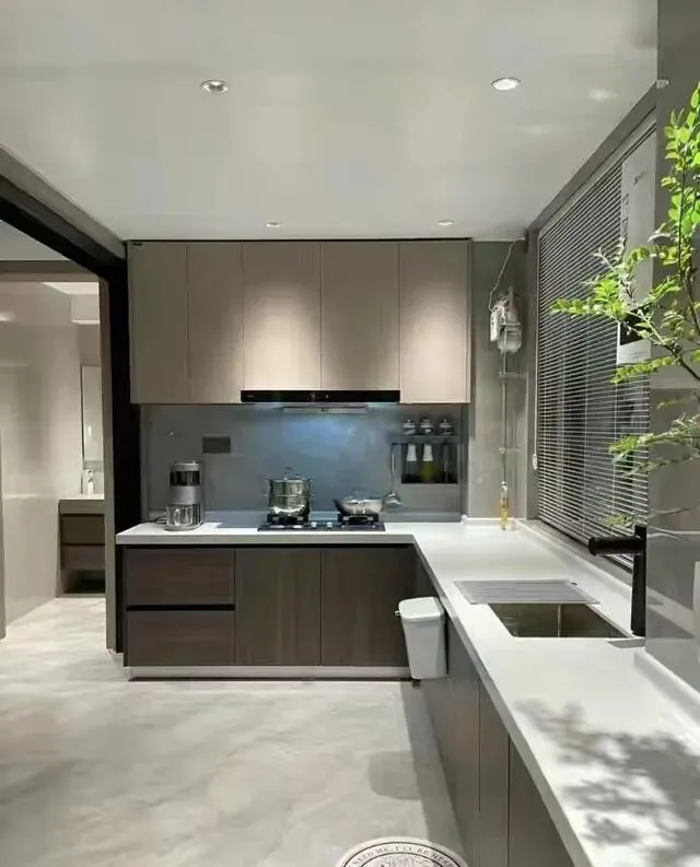 开了两扇窗 , 采光没话说。 浅棕色吊柜配白色地柜 , 看着就舒服 , 一点不压抑。