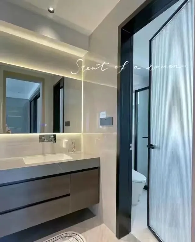 灯光选的暖黄色调 , 照镜子的时候气色都好看几分。 镜子周围做了一圈灯带 , 晚上洗漱光线刚刚好 , 不刺眼。