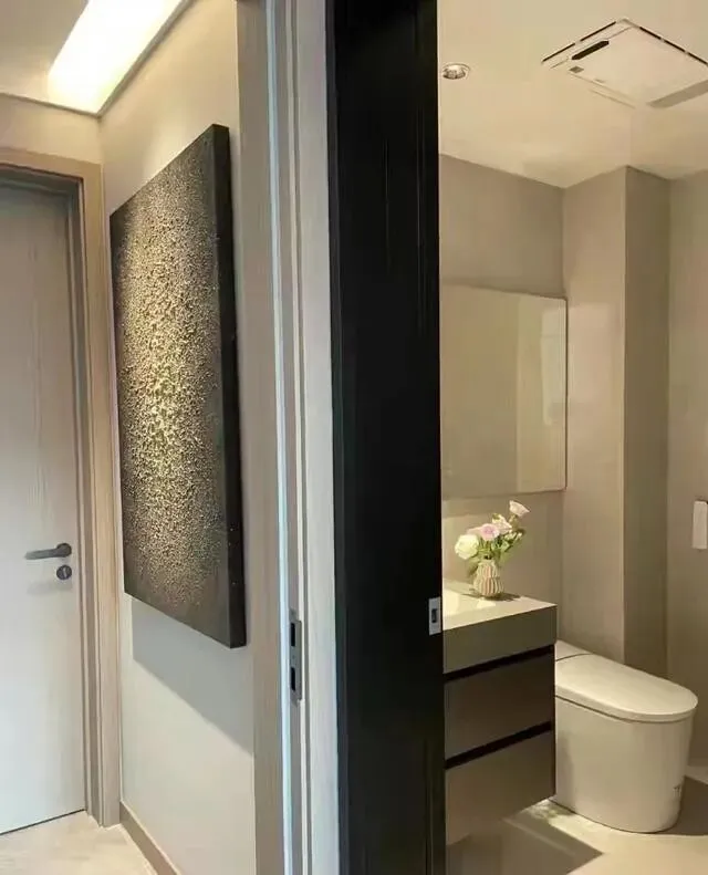 全屋瓷砖通铺 , 美缝也用的同色系 , 视觉上直接拉通 , 一点都不显乱。 很多人装修喜欢搞复杂造型 , 其实没必要 , 越简单越显空间。