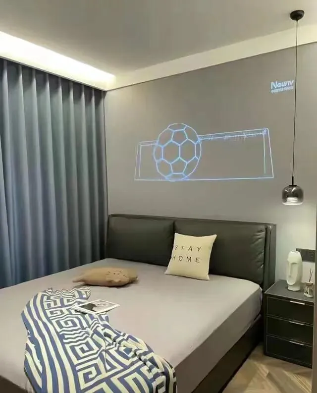 这间是孩子的房间吧 , 床头搞了个科技感十足的足球造型 , 男孩子应该会很喜欢!