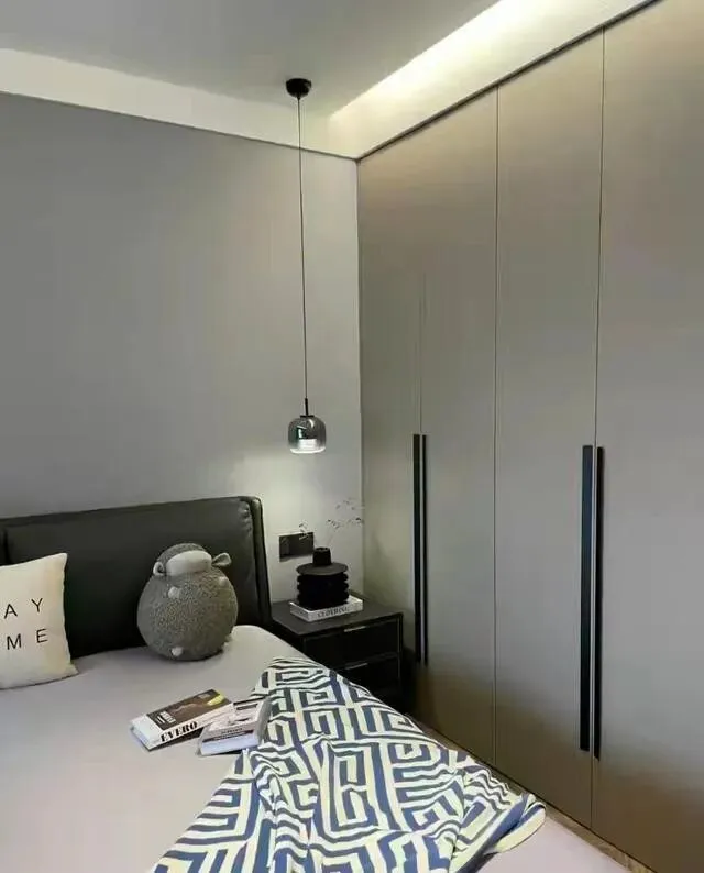 衣柜做了整面墙 , 收纳力拉满。 一盏简单的吊灯 , 氛围感有了 , 功能也到位了。