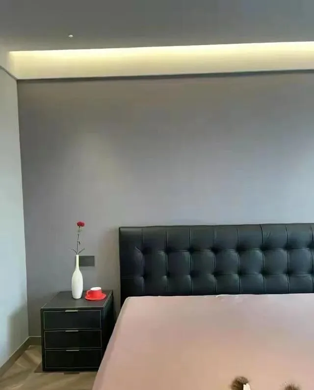 主卧的配色我很喜欢 , 墙面浅灰 , 窗帘同色系 , 但床品用了浅粉色。 全黑白太冷了 , 加一点暖色中和一下 , 睡觉才舒服嘛~