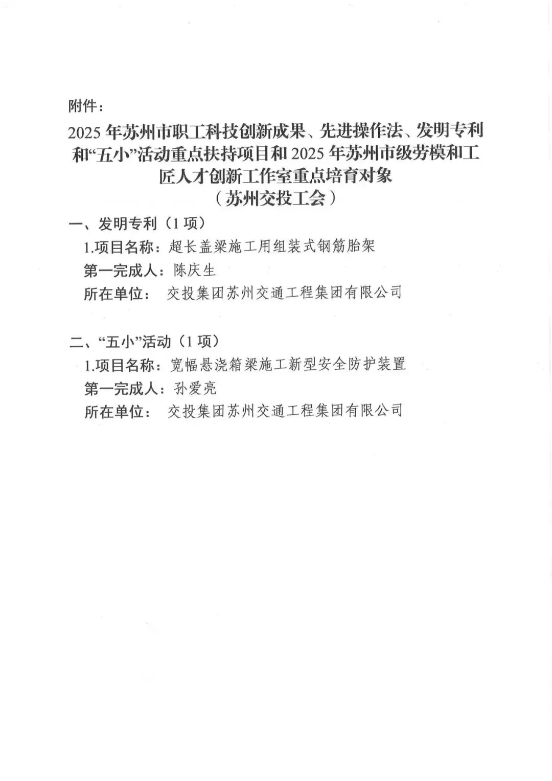此次两项职工创新成果的成功入选,不仅是苏交集团技术创新实力的具体体现,更是公司践行“服务于社会、服务于客户、服务于员工”核心价值的生动写照。超长盖梁组装式钢筋胎架有力提升了施工精度与工程品质,宽幅悬浇箱梁全封闭防护系统切实筑牢了高空作业的安全屏障,二者共同展现了苏交集团在推动施工工艺革新与安全生产标准化方面的领先水平。