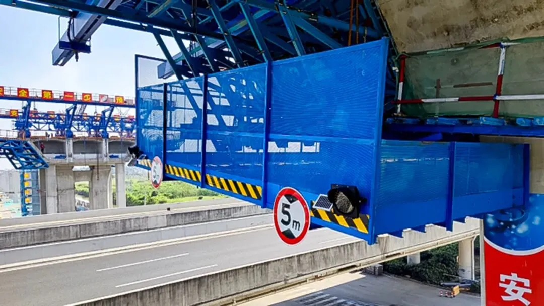 项目跨越交通繁忙的吴江大道,面临施工安全与道路通行的双重压力。传统挂篮施工存在防护盲区,小型物件坠落风险较高。项目团队创新设计出“全封闭式安全防护兜底”系统,在挂篮底模下方设置由型钢骨架、钢板底板和镂空立面构成的全封闭兜底,宛若一个坚固的“钢制托盘”,可百分之百承接高空坠落物。该系统与挂篮底模地面整体拼装后同步提升,大幅减少高空作业风险;通过精轧螺纹钢与挂篮主梁牢固连接,抗风稳定性强;镂空立面兼顾防护、通风与采光需求。该项技术实现了悬浇施工期间桥下道路的“零中断、零事故”,社会效益显著。