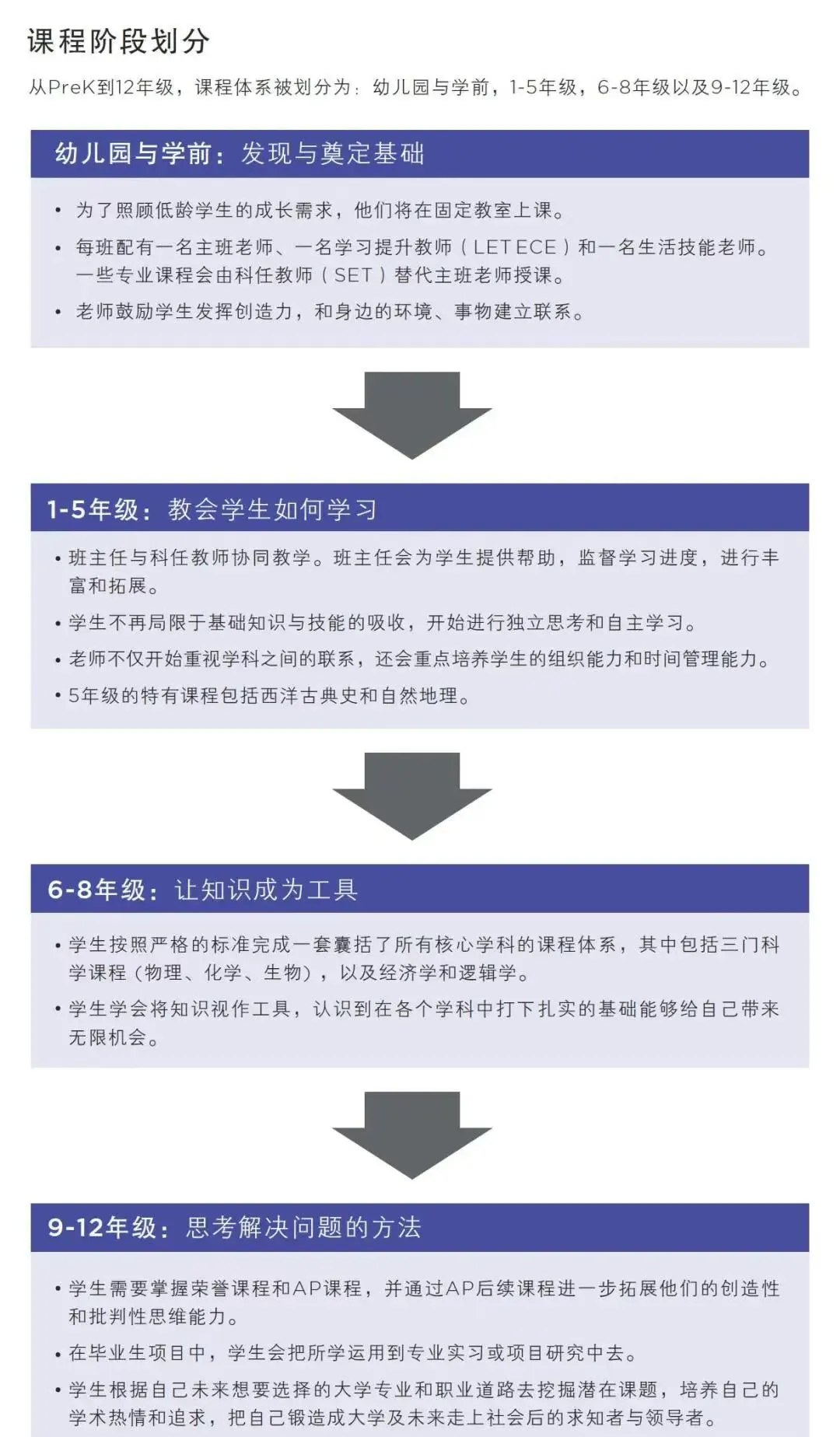 BASIS 实行STEM-focused Liberal Arts Program课程体系,即在重视STEM(科学、技术、工程、数学)学科学习的基础上,平衡发展、文理兼修的教学体系。其独特的螺旋式教学方式,深受学生的喜爱,根据每个学生的具体情况有针对性的设计课程,强调严格、超前、加速的要求以提升学生的责任感、克服困难的能力和学习热情。