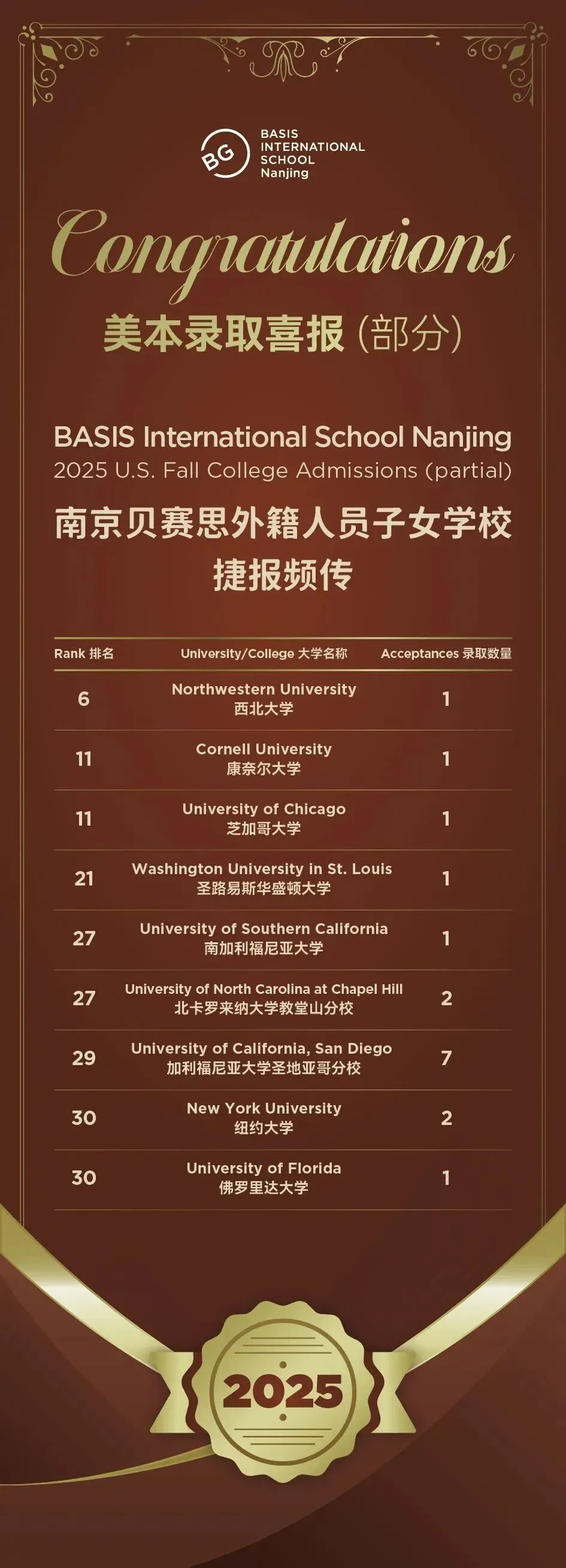 截至2025年3月20日,学校2025届(第三届)部分毕业生已收到录取通知书,其中包括了西北大学(《美国新闻与世界报道》美国大学排名第6)、康奈尔大学(《美国新闻与世界报道》美国大学排名第11)、芝加哥大学(《美国新闻与世界报道》美国大学排名第11)、圣路易斯华盛顿大学(《美国新闻与世界报道》美国大学排名第21)、南加利福尼亚大学(《美国新闻与世界报道》美国大学排名第27)、北卡罗来纳大学教堂山分校(《美国新闻与世界报道》美国大学排名第27)、加利福尼亚大学圣地亚哥分校(《美国新闻与世界报道》美国大学排名第29)、纽约大学(《美国新闻与世界报道》美国大学排名第30)、佛罗里达大学(《美国新闻与世界报道》美国大学排名第30)等世界一流高校的录取!