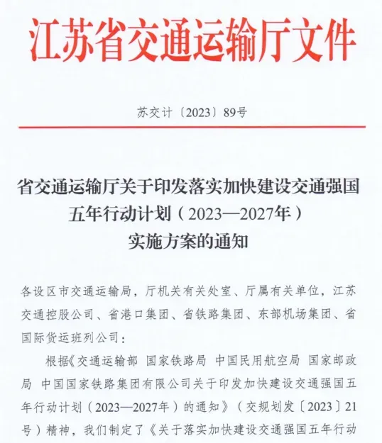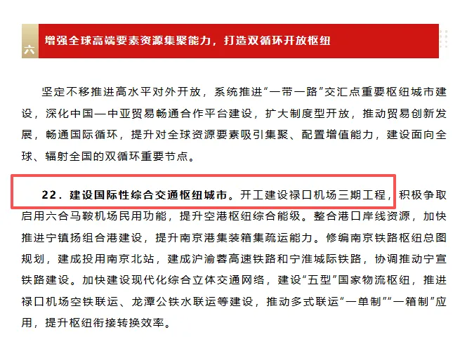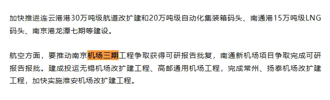 2023年11月份,江苏省交通运输厅发的关于印发落实加快建设交通强国五年行动计划(2023-2027)实施方案,重点指出了要提升枢纽机场竞争力,提升南京禄口机场国际枢纽能级,建设南京禄口机场三期工程,加快推进其他机场提质扩容,加快建设“轨道上的机场群。”