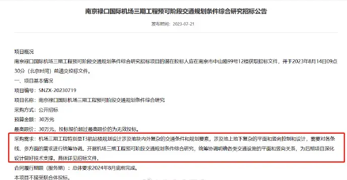 2023年8月,南京禄口国际机场三期工程发布预可阶段交通规划条件综合研究招标公告发布,总体要求2024年8月底前完成。公告显示,南京机场三期工程特别是T3航站楼规划设计涉及地块内外复杂的交通条件和规划要素,涉及地上地下复杂的平面和竖向控制和设计,需要对各条线、多方面的需求进行统筹协调。开展机场三期工程预可阶段交通规划条件综合研究,统筹协调明确各类交通设施的平面和竖向关系,为后期项目深化设计做好技术支撑。