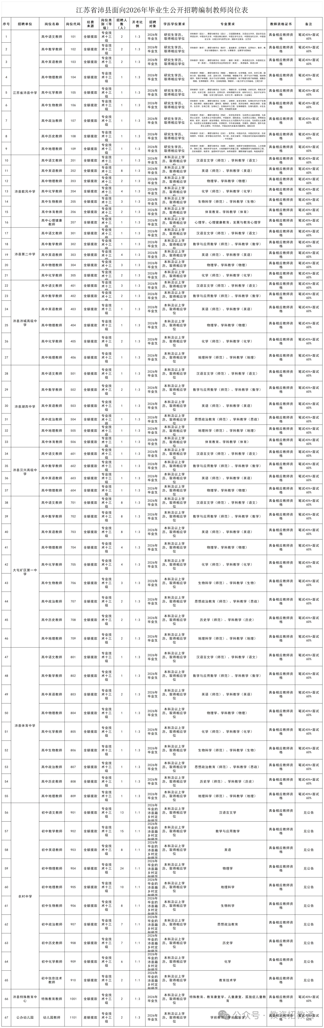 招聘对象为2026年毕业的沛县籍乡村定向师范生只进行笔试。