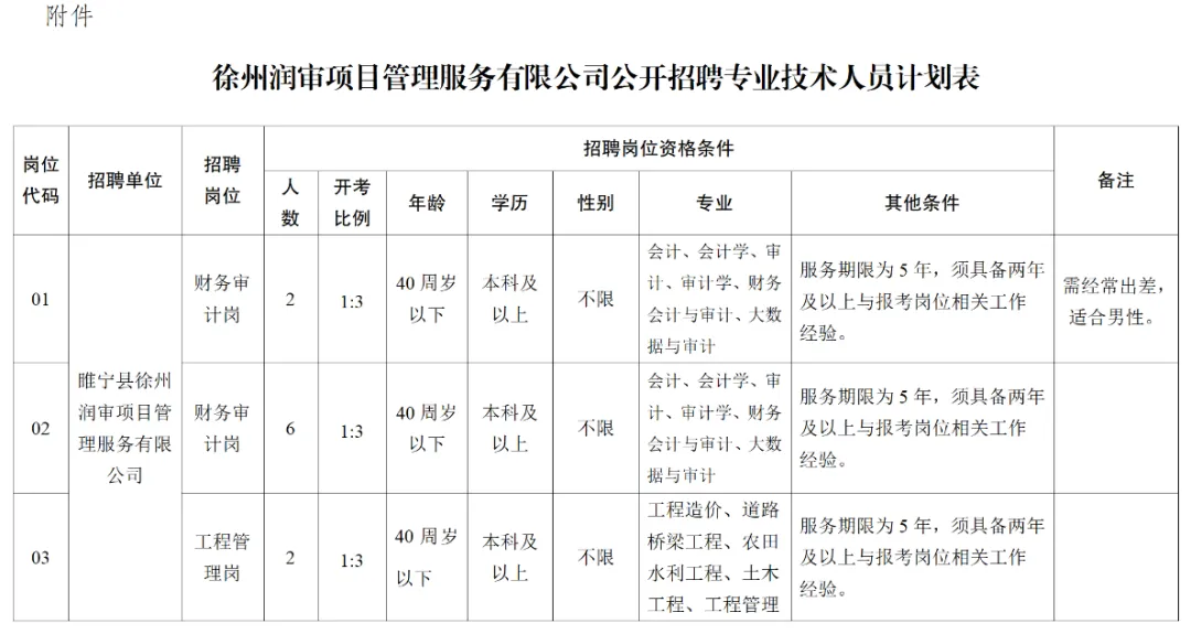 为进一步优化补充徐州润审项目管理服务有限公司(以下称润审公司)专业技术人员队伍,结合公司发展需要,现委托睢宁县劳动保障事务代理服务中心面向社会公开招聘专业技术人员10名。现将招聘事宜公告如下:(二)遵守中华人民共和国宪法和法律,拥护中国共产党领导和社会主义制度;(三)具有良好的品行、较强的服务意识、保密意识以及高度的责任心和事业心;(四)具备正常履行岗位职责的身体条件和符合职位要求的工作能力;(六)年龄在18周岁以上,40周岁(含)以下(1985年1月至2008年1月期间出生);(七)符合报考岗位所需的其他条件,具体要求详见《睢宁县徐州润审项目管理服务有限公司公开招聘专业技术人员计划表》(附件);(八)下列人员不得报考:现役军人或国民教育序列普通高校在读学生;尚未解除纪律处分或正在接受纪律审查的人员;涉嫌违法犯罪正在接受调查的人员;曾因犯罪受过刑事处罚的人员和曾被开除公职的人员;参与违规信访人员;有政策规定或协议明确不得解聘、离开现工作单位(岗位)的人员;有其他原因不适合从事本工作的人员。本次招聘采用网上报名方式进行。报名信息、照片上传、资格初审和缴费确认,通过网络同步进行。1.报名网址:江苏省睢宁县公开招聘考试报名系统(http://sndlzx.pzhl.net/index.php);2.报名、资料上传时间:2026年1月10日9:00—1月13日18:00;3.修改和补充信息时间:2026年1月10日9:00—1月14日18:00;4.缴费时间:2026年1月10日9:00—1月14日24:00。1.应聘人员网上提交报名信息24小时后可到报名网站查询资格初审意见,如对初审意见有异议,请及时向睢宁县劳动保障事务代理服务中心或徐州润审项目管理服务有限公司申辩。2.通过初审后的应聘人员须在网上缴纳报名费100元。3.通过初审并且完成照片上传、缴费确认的人员,即报名成功。缴费成功后,除应聘岗位被取消外,不退还报名费。4.规定时间内未在网上确认报名资格、上传照片、缴纳报名费的,视为报名无效。逾期不再提供报名服务。1.应聘人员应按岗位要求和网上提示,真实、准确、完整地填写有关信息,并上传本人免冠电子证件照片(近期免冠正面证件照,jpg格式,尺寸为295×413像素,大小20-100kb)。2.考生必须对报名时提供材料的真实性负责。资格审查贯穿招考全过程,凡弄虚作假的,一经查实,即取消应聘资格。除本公告另有说明,或者国家、省另有规定外,信息真实性以报名时的实际情况为准,面试前将对进入面试的人员进行资格复审。3.每人只能选择一个岗位进行报名。资格初审通过后,不能再更改报名信息。未通过资格初审的应聘人员,在报名期内,可以改报符合资格条件的其他岗位。应聘人员须使用有效期内的第二代居民身份证进行报名,报名与考试使用的身份证必须一致。4.报考人员专业要求参照《江苏省2026年度考试录用公务员专业参考目录》,招考岗位见附件《徐州润审项目管理服务有限公司公开招聘专业技术人员计划表》。5.如报名人数未达到最低笔试开考比例1:3,则相应核减或取消该招聘岗位。【特别提醒:应聘人员务必诚信报名,参加报名即视为认可本次招聘公告确定的报名办法和招聘程序等规定,个人信息应针对岗位资格条件,真实、准确、有效地填写。应聘人员应确认本人完全符合相关岗位的资格条件,如对资格条件和岗位要求存在疑问,应及时向睢宁县劳动保障事务代理服务中心或徐州润审项目管理服务有限公司进一步咨询确认。如不符合资格条件仍然坚持报名的,由此产生的后果自行承担。】通过资格初审并缴纳考试费的应聘人员,可在2026年1月15日12:00—2026年1月17日8:30到原报名网站下载并打印准考证。未在规定时间内打印准考证的视为自动放弃笔试资格。(笔试时间、地点、要求等详见《笔试准考证》)1.本次考试不指定辅导用书,不举办、不委托任何机构举办考试辅导培训班。笔试满分为100分。2.应聘人员应携带本人有效期内的二代身份证原件和《笔试准考证》,按规定时间和地点参加笔试。具体时间、地点详见《笔试准考证》。3.笔试为全程封闭考试,考试期间不得提前交卷、退场。4.笔试成绩以百分制形式在睢宁县劳动保障事务代理服务中心微信公众号、睢宁e就业(https://www.snejob.com/)公布。由县劳动保障事务代理服务中心会同徐州润审项目管理服务有限公司划定各岗位笔试合格分数线,在笔试合格人员中按岗位招聘人数与报考人数1:3的比例从高分到低分确定资格复审人选(末位成绩并列的,一并参加),不足相应比例的,按实际人数确定。1.资格复审时间、地点将于笔试结束后在睢宁县劳动保障事务代理服务中心微信公众号、睢宁e就业(https://www.snejob.com/)最新公告栏进行公示。(1)打印并携带《徐州润审项目管理服务有限公司公开招聘专业技术人员资格审查表》原件(初审合格人员登录报名系统打印);(3)毕业证书原件和复印件、《教育部学历证书电子注册备案表》打印件(通过学信网查询打印,网址为:http://www.chsi.com.cn),国(境)外学历学位报考者另提供教育部留学服务中心出具的国(境)外学历学位认证证明原件和复印件(须在报名日期截止前取得留学服务中心的认证;已取得学位证的考生,可同时提供学位证原件及复印件);(4)附件《招聘计划表》中“招聘岗位资格条件”里关于两年及以上与报考岗位相关工作经验的证明性材料,相关要求详见复审公告。(1)