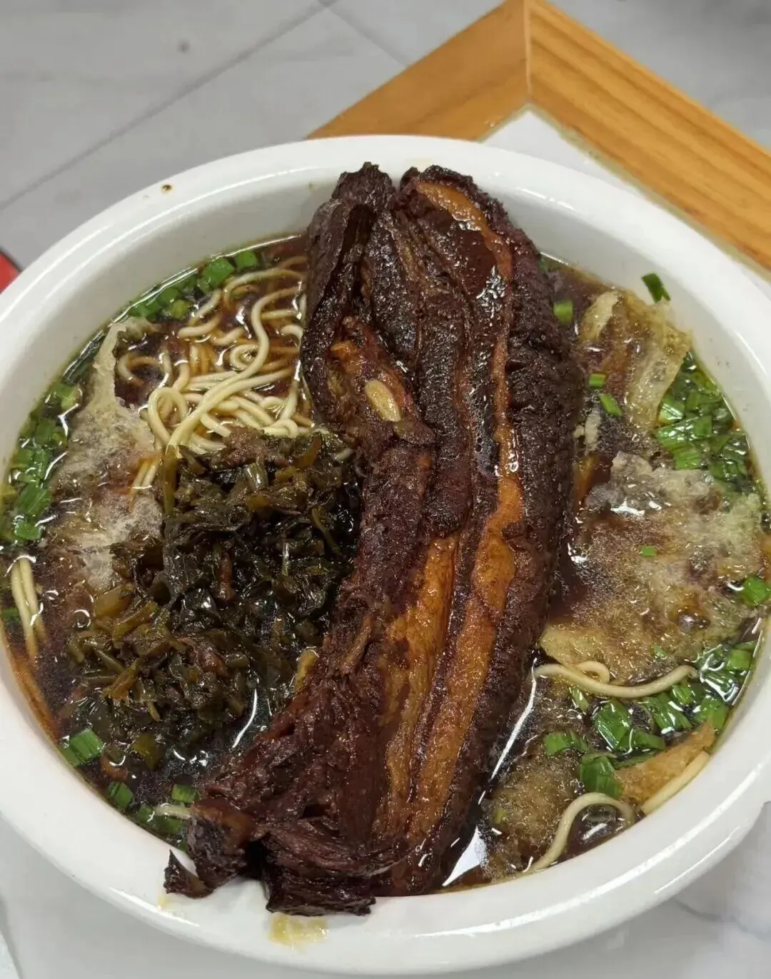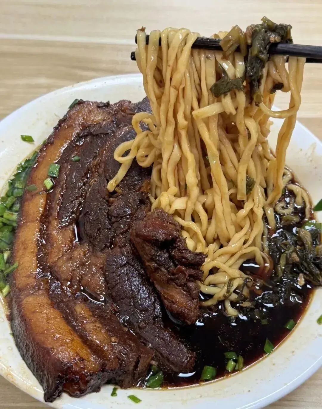 ,口感有点像镇江锅盖面。老卤汤虽然色儿深,但喝起来不齁甜。咱家那位干体力活或者带娃累了的时候,吃这一碗最解馋。虽然肉多,但炖得挺入味,吃完浑身暖呼呼的。