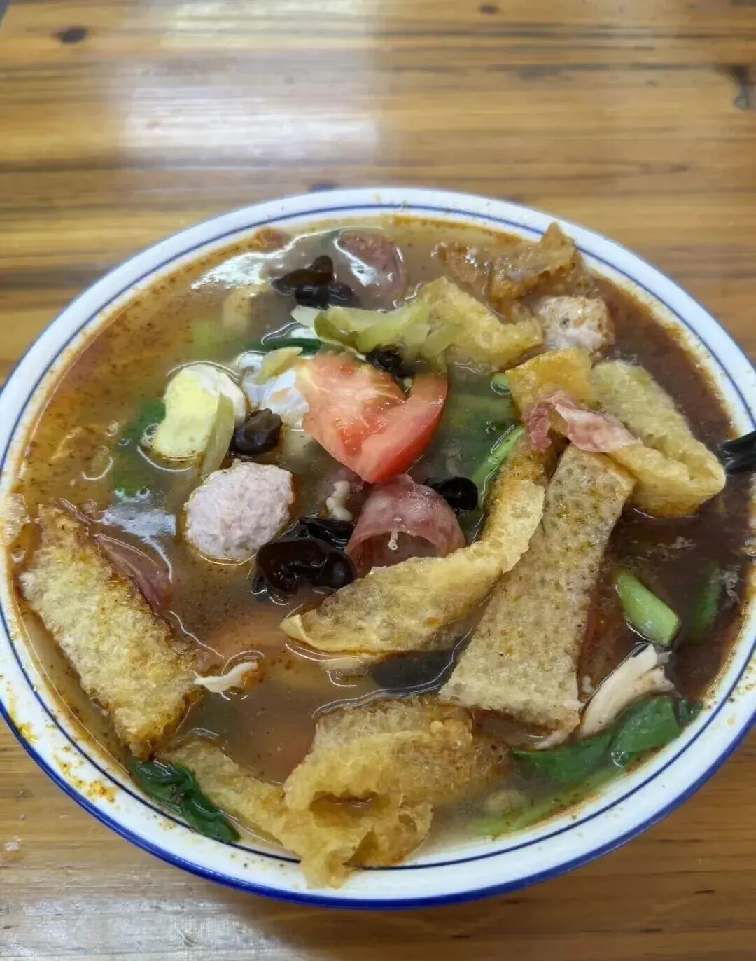 ,里面皮肚、肉丸、香肠、鸡蛋堆得像小山。南京人做面舍得堆料,这一大碗下去,哪怕是成年男子都得吃撑。皮肚吸满了汤汁,咬下去