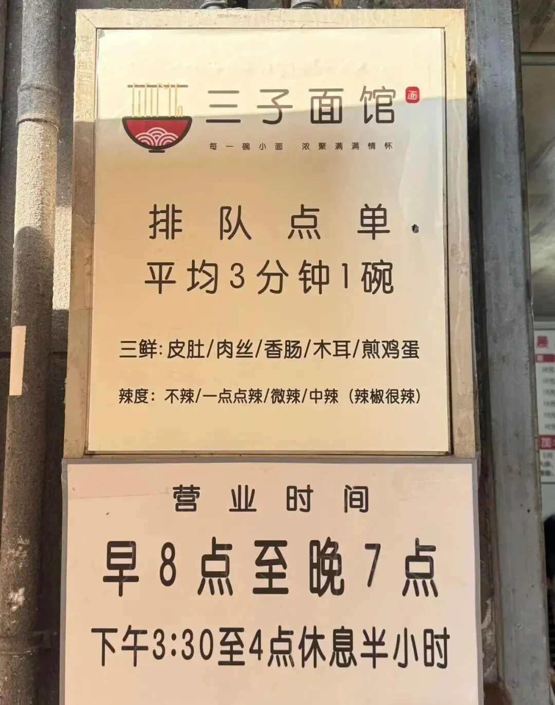 相比之下,三子面馆就在小巷子里,没招牌还得排队。他们家