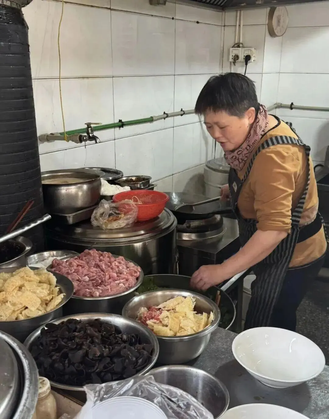 ,里面皮肚、肉丸、香肠、鸡蛋堆得像小山。南京人做面舍得堆料,这一大碗下去,哪怕是成年男子都得吃撑。皮肚吸满了汤汁,咬下去