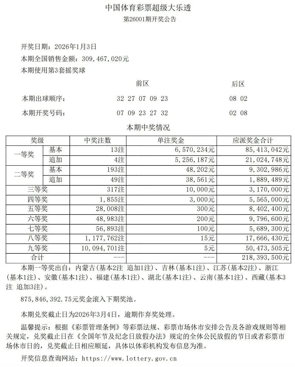 近日,超级大乐透第26001期、即2026年的首期开奖。前区开出号码07、09、23、27、32;后区开出号码02、08。苏州3205025427网点——位于昆山前进西路1588号天地华城商业内街的体彩网点开出一等奖1注,奖金达657万元。