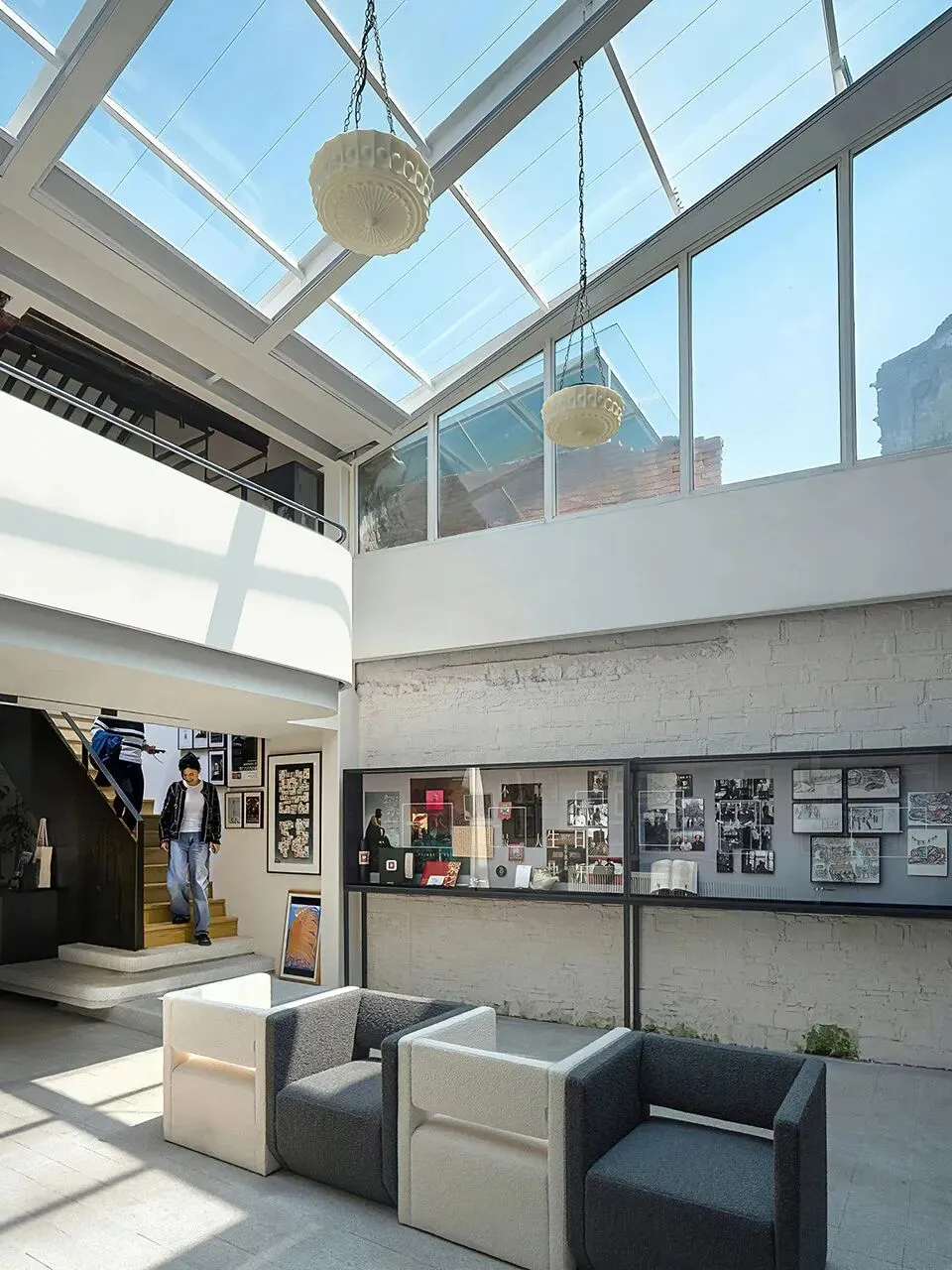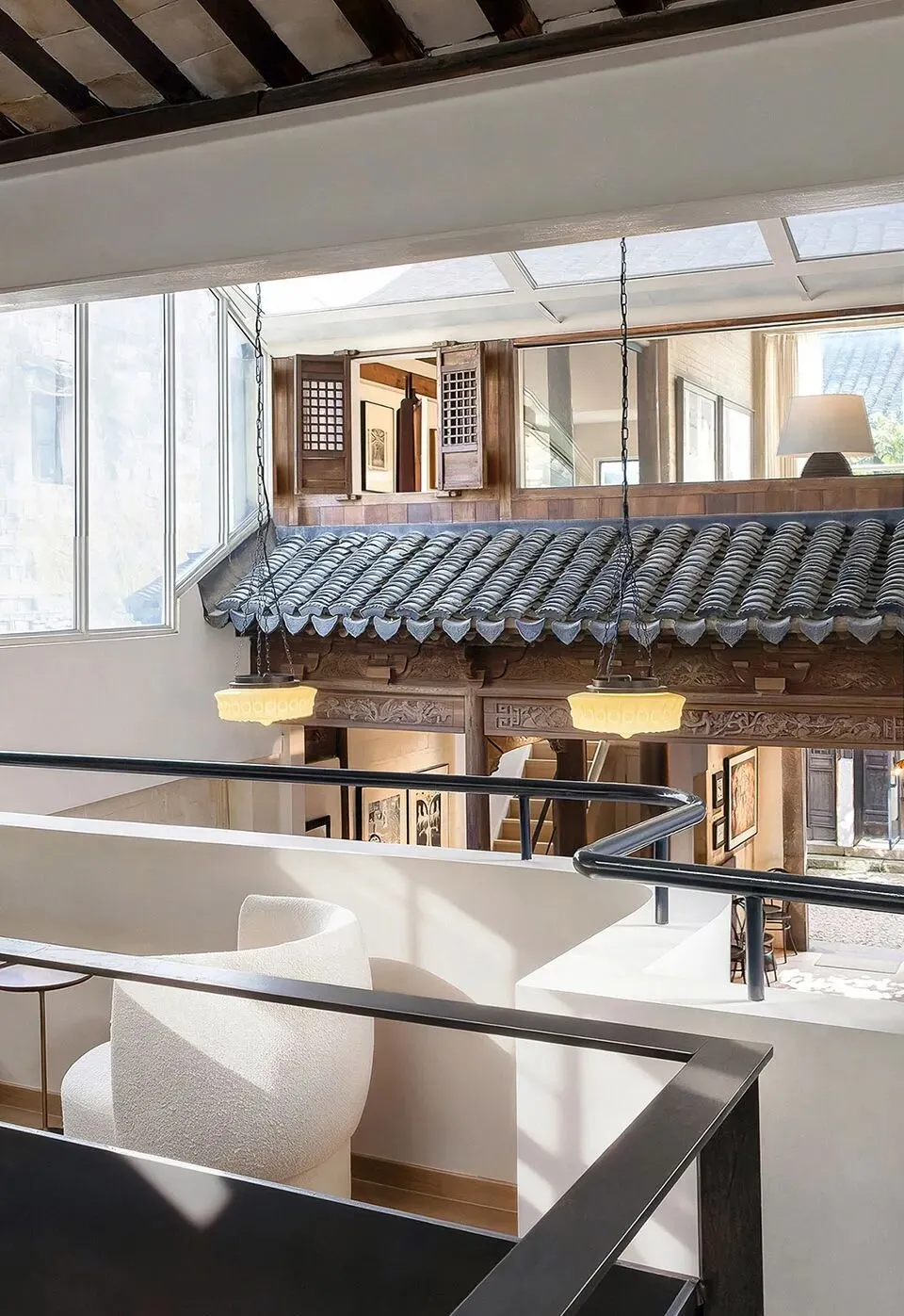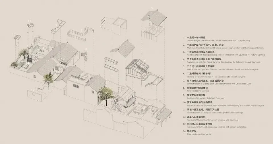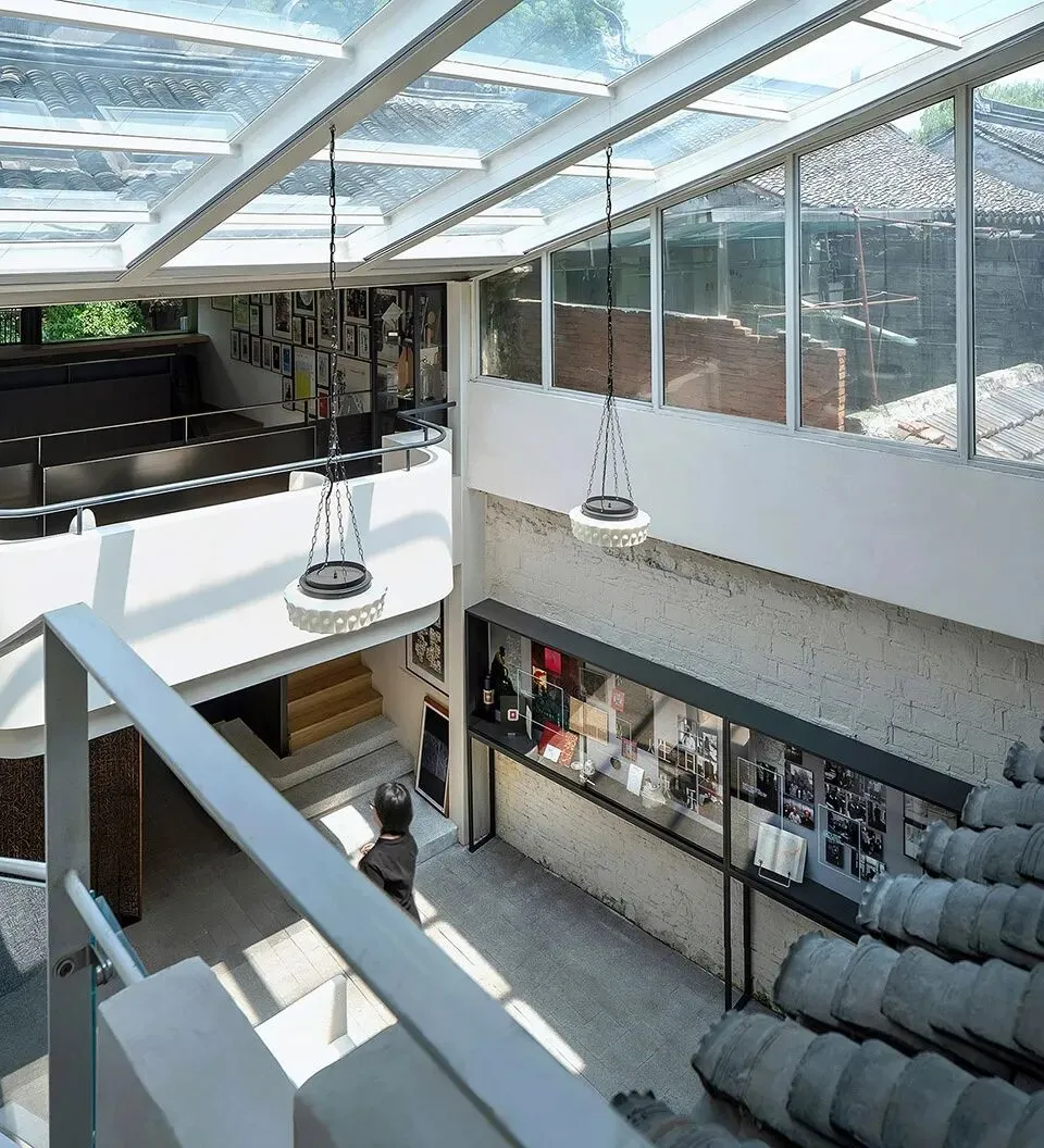 原有一进为两层低矮狭小空间,设计通过局部钢结构置换,挑空中部,在二层形成展览环廊,沿河阅读空间设玻璃观景长窗,面窗景拾阶而上,步移景异。南向增加天窗将光线引至一层,与暗弄之间开设洞口增加采光互动,将原本阴暗压抑的封闭扁平空间转化成开放明亮的立体空间。