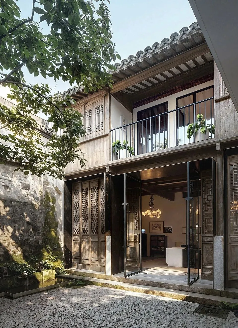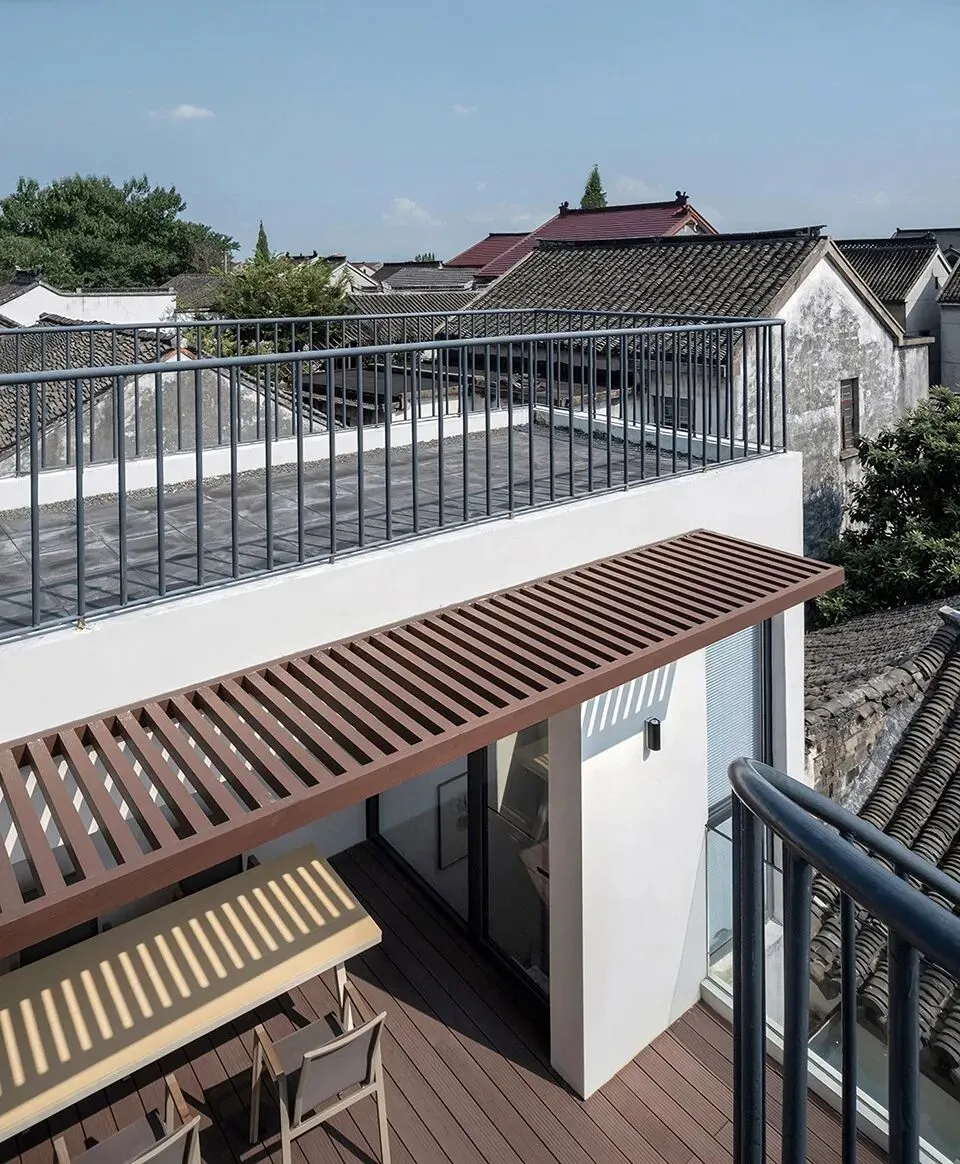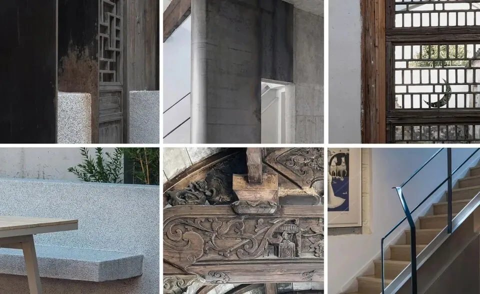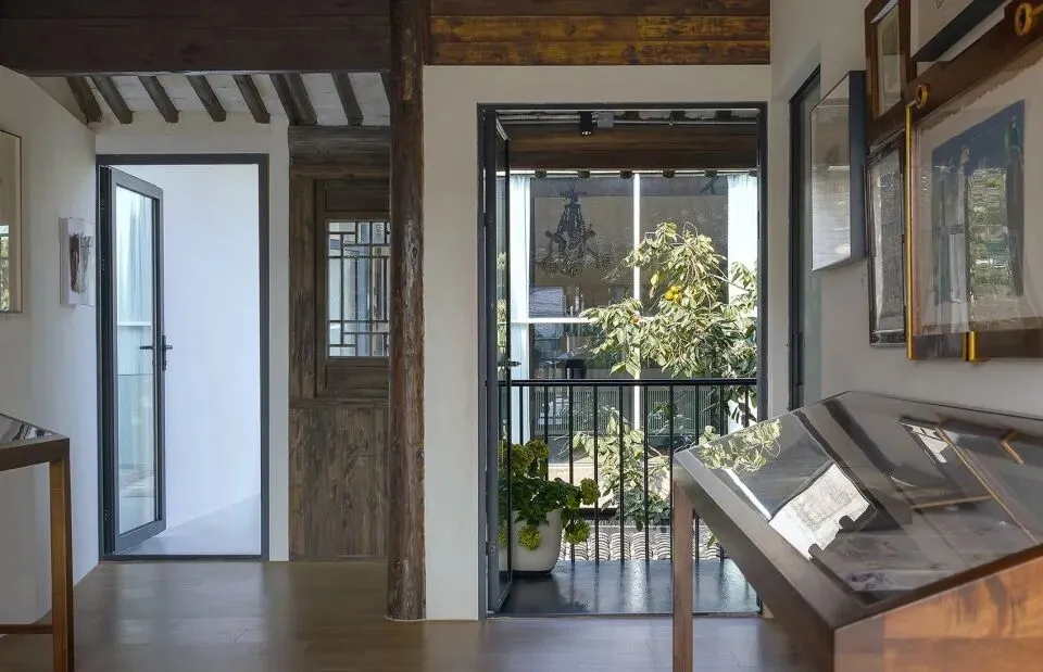 二进院内新植柿树一颗,院落西侧架设连廊,连廊下设树院咖啡,三进北向二层退让出内阳台与树院画廊互动,损毁木构采用建筑拆下旧木修复,利旧产生的规格形式不统一在热轧钢板和玻璃门的协同下进行对称性分组。在江南潮湿的环境下,新水景与旧墙很快融为一体。