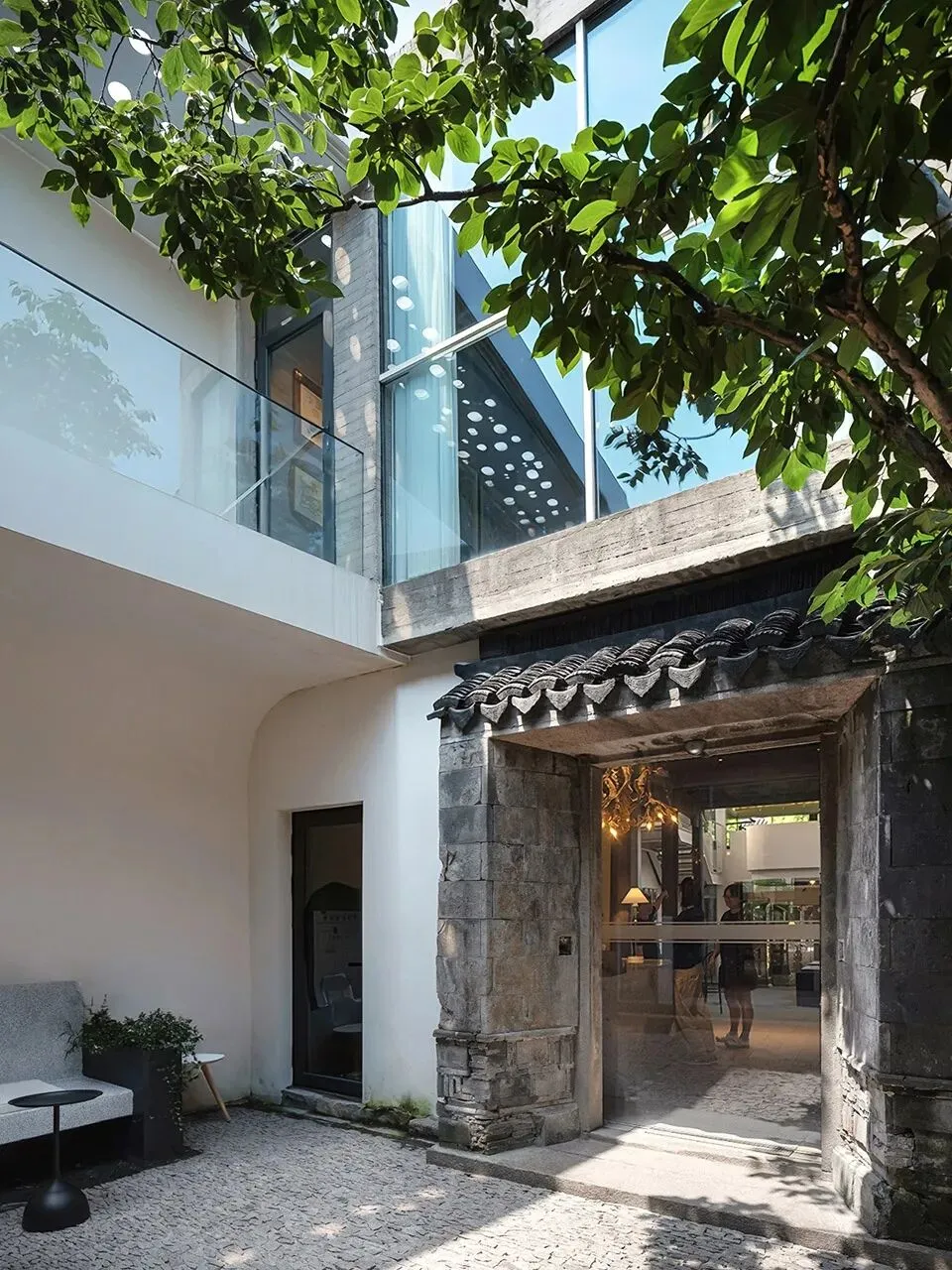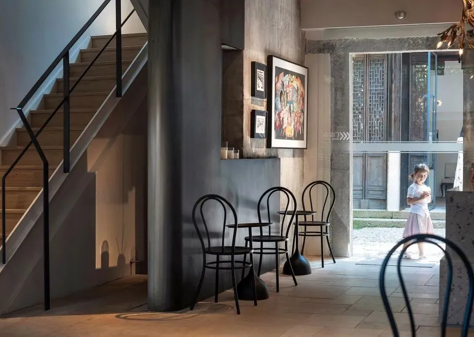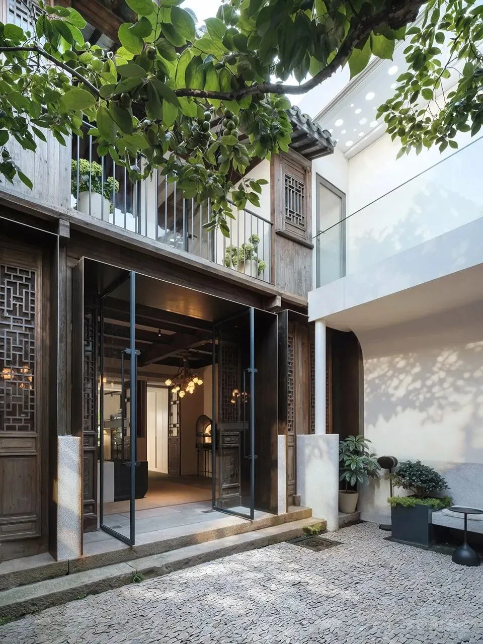 二进院内新植柿树一颗,院落西侧架设连廊,连廊下设树院咖啡,三进北向二层退让出内阳台与树院画廊互动,损毁木构采用建筑拆下旧木修复,利旧产生的规格形式不统一在热轧钢板和玻璃门的协同下进行对称性分组。在江南潮湿的环境下,新水景与旧墙很快融为一体。