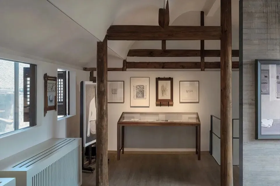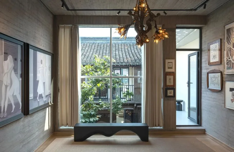 二进西侧原有墙体倾斜严重,嵌入新建混凝土结构盒子在加固同时用结构形成独立的画廊空间。由于当地无清水混凝土施工经验带来的瑕疵粗粝反而使得新旧关系变得融合。画廊大玻璃因整块无法搬入用金属条做了十字形压缝,让人想起卡斯帕·大卫·弗里德里希(Caspar David Friedrich)的绘画与路易斯·巴拉甘(Luis Barragán)自宅。