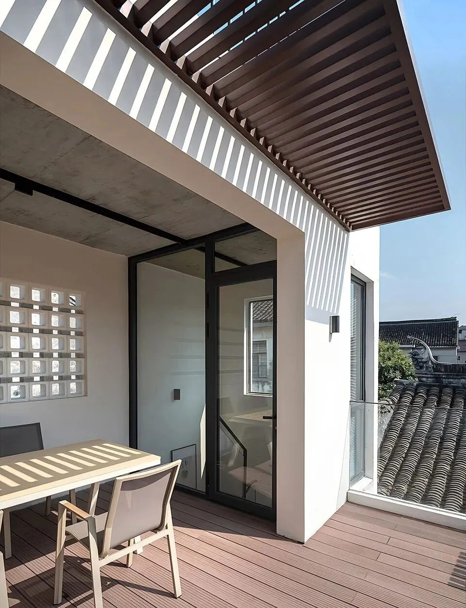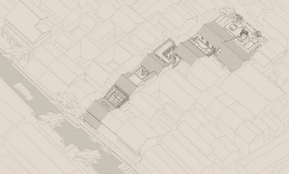 三进与三进院合并为扩大三进的阅读展览空间,留出芭蕉天井为两侧空间提供自然采光与景观。利用屋面形成两层室外露台,首层露台与整体空间形成游园式的参观洄游动线,第二层露台与屋顶相连,回应《繁花》中的片段:“两个人从假三层爬上屋顶,瓦片温热”。