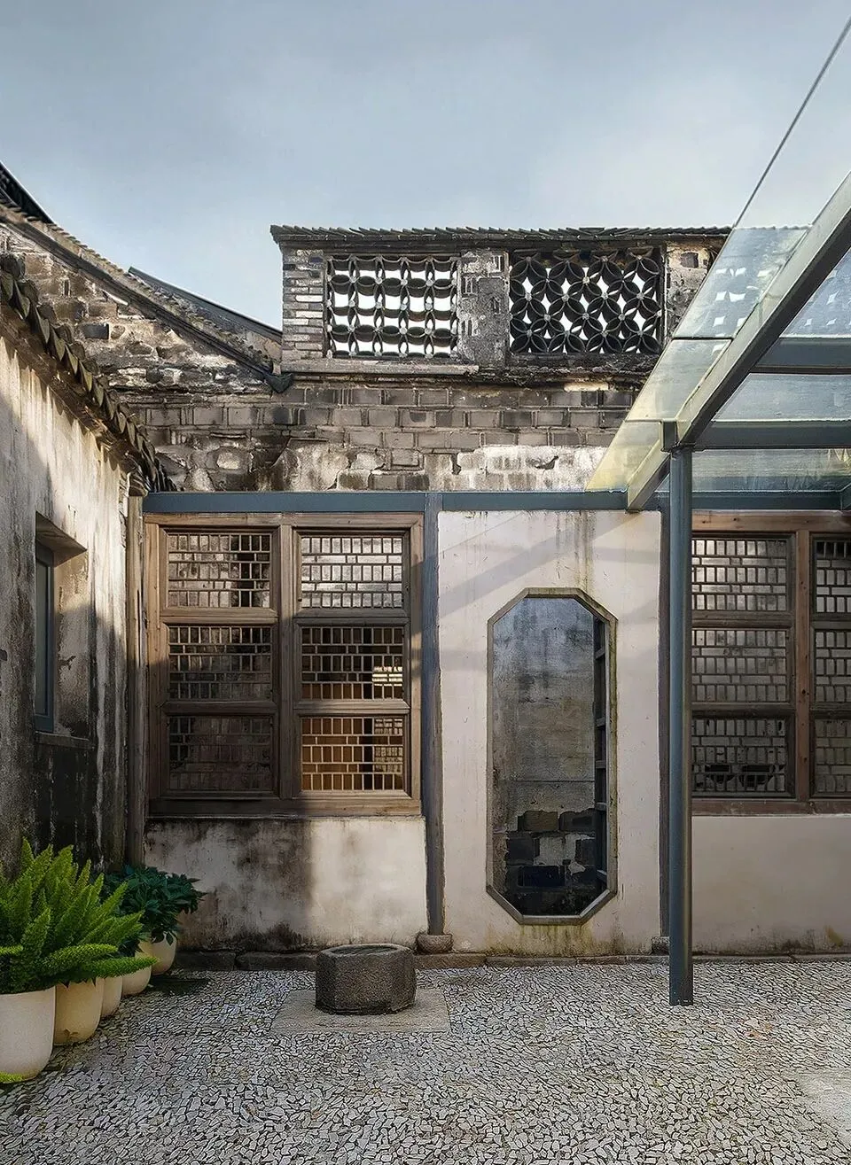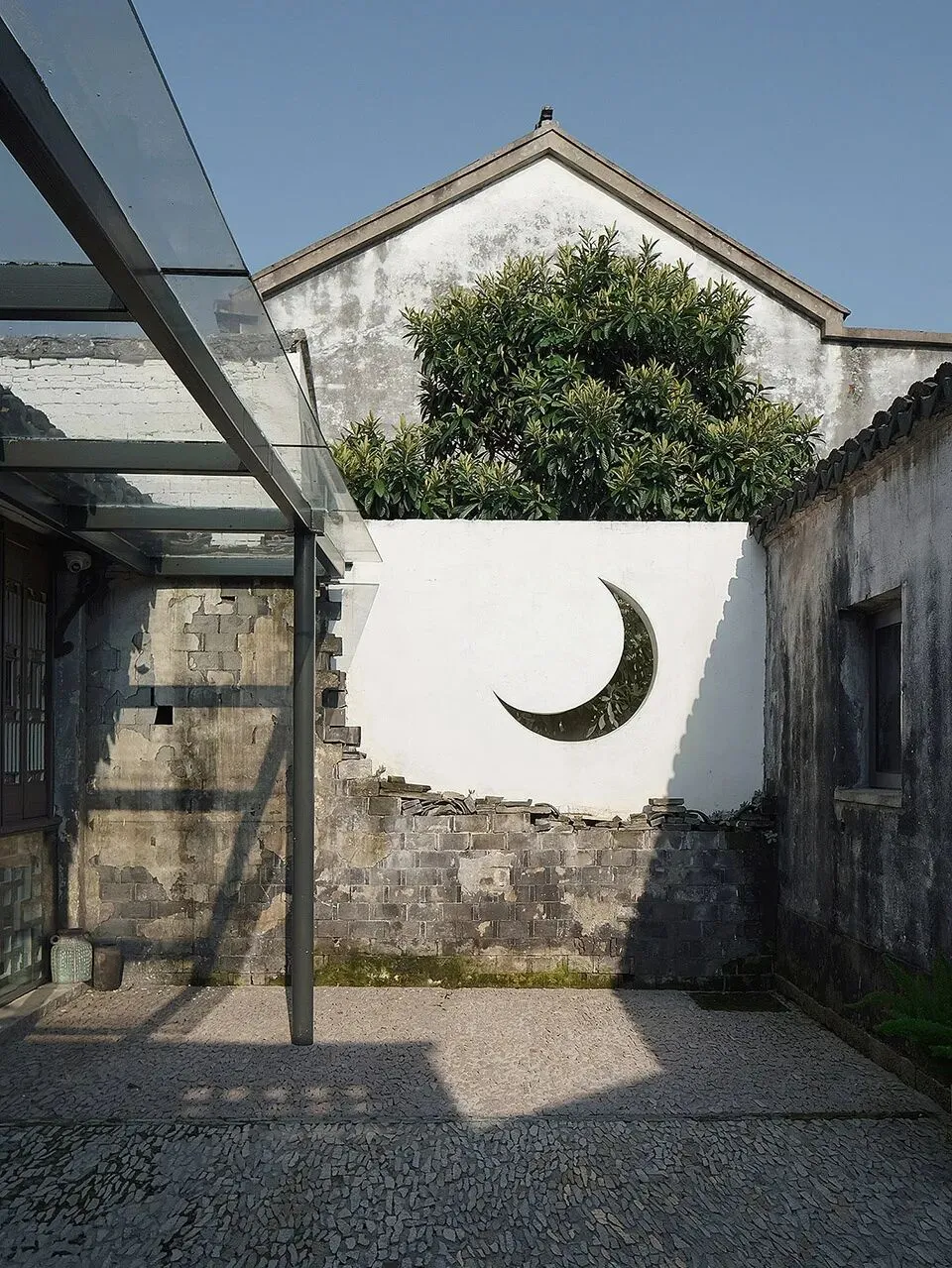 四进修缮时为避让院内新发现的夏鹭井,将围墙门窗做了平移互换。院东侧围墙垮塌大半,设计未按常规方式补砌完整,于背面重新做了新墙加固映衬残墙,镂空月亮造型是当地传统花窗透景的另一种独特表达方式,更是与对面围墙顶部高高在上的铜钱瓦窗形成了文学的隐喻。