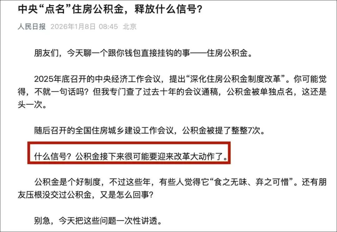 文章提到:2025年底召开的中央经济工作会议,提出“深化住房公积金制度改革”。过去十年的会议通稿,公积金被单独点名,这还是头一次。随后召开的全国住房城乡建设工作会议,公积金被提了整整7次。