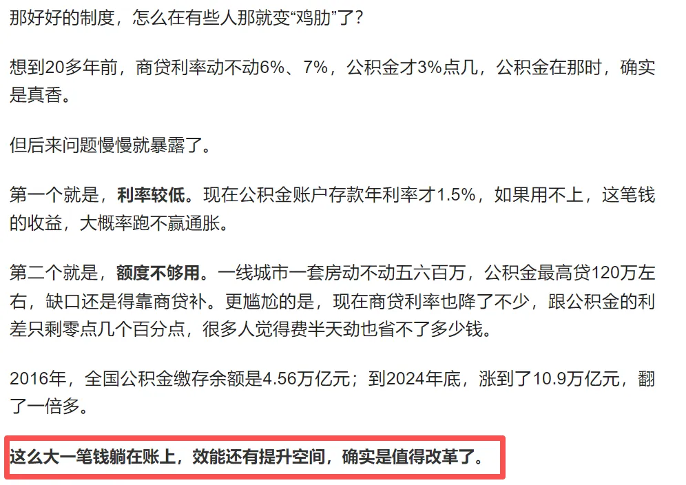 文章还特别提到,2016年,全国公积金缴存余额是4.56万亿元;到2024年底,涨到了10.9万亿元,翻了一倍多。这么大一笔钱躺在账上,效能还有提升空间,确实是值得改革了。