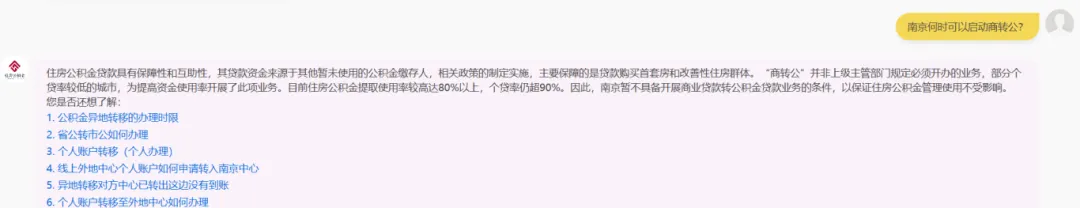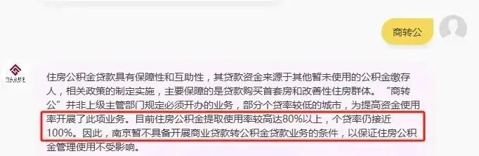 不过,南京目前还不能“商转公”,我刚刚在南京住房公积金官网咨询了一下何时可以启动商转公,智能客服回复表示:目前住房公积金提取使用率较高达80%以上,个贷率仍超90%。因此,南京暂不具备开展商业贷款转公积金贷款业务的条件,以保证住房公积金管理使用不受影响。