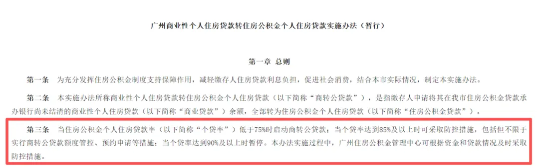 根据《广州商业性个人住房贷款转住房公积金个人住房贷款实施办法(暂行)》,当住房公积金个人住房贷款率(以下简称“个贷率”)低于75%时启动商转公贷款;当个贷率达到85%及以上时可采取防控措施,包括但不限于实行商转公贷款额度管控、预约申请等措施;当个贷率达到90%及以上时暂停。