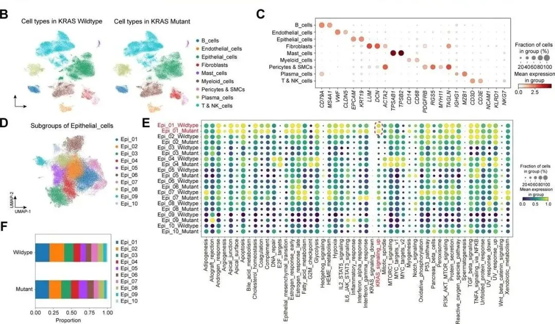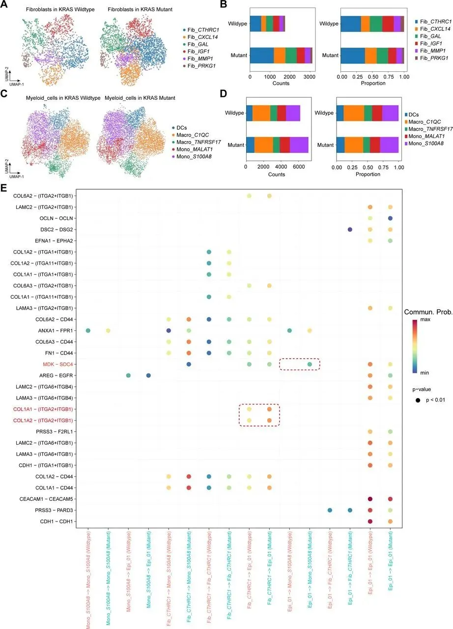 整合 27 例 KRAS 野生型与 27 例突变型 CRC 公开 scRNA-seq 数据,经质控(去双细胞、筛低质量细胞)获 136,890 个高质量细胞,聚类注释出 8 类主要细胞类型;上皮细胞细分 10 亚群,Epi_01 的 KRAS 信号评分最高(突变型 > 野生型),为 KRAS 突变相关上皮细胞(标志物 CEACAM1),其在两组中比例相近,提示 KRAS 突变可能通过重塑 TME 发挥作用。Fib_CTHRC1和Mono_S100A8在KRAS突变CRC中发挥关键作用