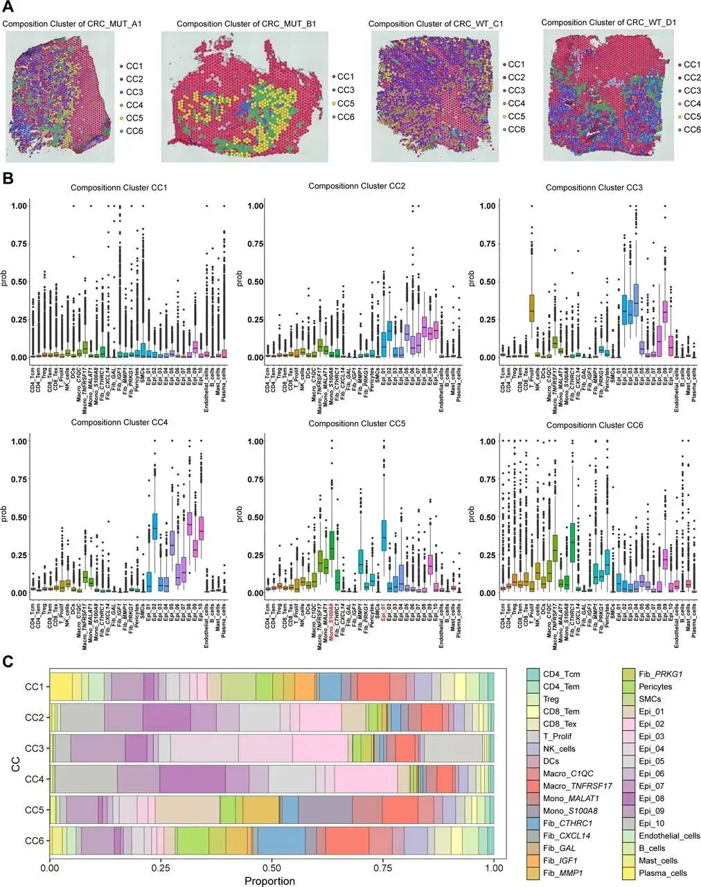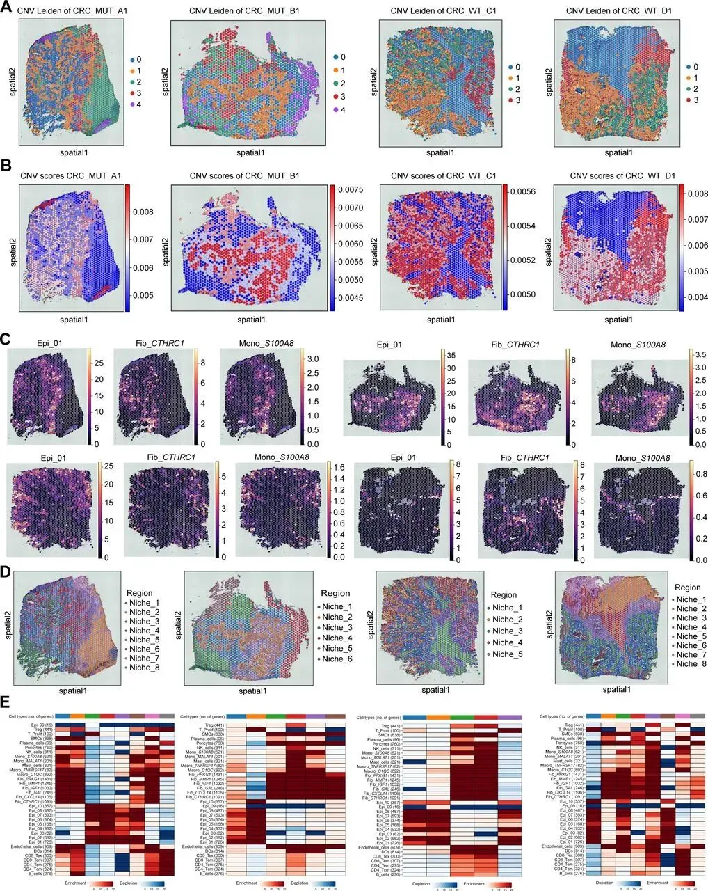 分析 KRAS 野生型与突变型 CRC 的 TME 差异,发现突变组成纤维细胞和髓系细胞比例显著更高,对二者进一步亚聚类:成纤维细胞分为 6 个亚群,其中 Fib_CTHRC1 比例差异最大且最丰富;髓系细胞分为 5 个亚群,Mono_S100A8 比例差异最显著,二者均为突变型 TME 关键细胞。通过 CellChat 分析,突变组中 Epi_01 释放 MDK 配体结合 Mono_S100A8 的 SDC4 受体,Fib_CTHRC1 分泌 COL1A1/COL1A2 结合 Epi_01 的 ITGA2/ITGB1 受体。临床关联显示,Epi_01、Fib_CTHRC1、Mono_S100A8 高表达均与患者不良预后相关,且在化疗不敏感肿瘤中丰度显著升高;Epi_01 和 Fib_CTHRC1 还与肿瘤晚期分期、淋巴结转移相关,Mono_S100A8 主要通过构建免疫抑制微环境促进治疗耐药和转移。为分析肿瘤异质性与治疗耐药的关联,本研究以高表达免疫标志物的位点为参考,通过 inferCNV 方法评估各位点 CNV 状态。Leiden 聚类显示,KRAS 突变组肿瘤有 5 个 CNV 状态亚组,多于野生型的 4 个,提示其异质性更高;空间转录组分析中,高 CNV 评分区域对应肿瘤区、低评分对应基质区,且突变型各微环境的平均 CNV 水平有特征差异,表明 KRAS 突变肿瘤恶性程度和治疗抵抗性更强。利用含 34 种细胞亚型的 scRNA-seq 数据集,通过 Cell2location 算法对 ST 数据去卷积,获得各位点细胞丰度评分,发现 KRAS 突变组 Epi_01、Fib_CTHRC1、Mono_S100A8 丰度高于野生型,印证微环境差异。提取两类数据的差异表达基因进行多模态交集分析(p<0.01,超几何检验),以热图展示 34 种细胞在不同微环境的富集水平,为后续细胞共定位及网络互作分析奠定基础。采用 MISTy 机器学习框架分析 KRAS 突变型 CRC 的细胞空间分布与互作,发现肿瘤区域内细胞共现类型可预测近景空间尺度的肿瘤相关区室。KRAS 突变组中 Epi_01 与 Mono_S100A8 共定位显著,野生型组较弱;Fib_CTHRC1 未与二者直接共定位,但同型细胞网络与二者部分重叠,推测其形成纤维屏障。野生型肿瘤缺乏该三类细胞构成的网络。使用 ISCHIA 方法基于细胞共现特征聚类,识别出 CRC 的 6 种空间生态型。其中 KRAS 突变组特有 CC5 和 CC6:CC5 集中在肿瘤核心区,高丰度共定位 Epi_01 与 Mono_S100A8,为突变型特征生态型;CC6 分布于 CC5 外周,富含 Fib_CTHRC1 和淋巴细胞,形成排斥淋巴细胞的纤维屏障。Mono_S100A8 通过招募抑制性细胞、Fib_CTHRC1 通过形成纤维屏障,共同构建 KRAS 突变型 CRC 的免疫抑制微环境,野生型肿瘤无此结构。对各位点 34 种细胞类型归一化后,通过 Squidpy 计算邻接矩阵、弦图可视化,发现 KRAS 突变组中 Epi_01、Fib_CTHRC1、Mono_S100A8 相邻关系更频繁,还与 Fib_MMP1 形成紧密网络;野生型组无此网络,主要由其他上皮细胞组成。这进一步验证了 Fib_CTHRC1 通过环绕肿瘤细胞形成保护,支撑 KRAS 突变型 CRC 的免疫抑制微环境。Fib_CTHRC1和Mono_S100A8在KRASG12D/+;Villin-Cre小鼠中发挥关键作用
