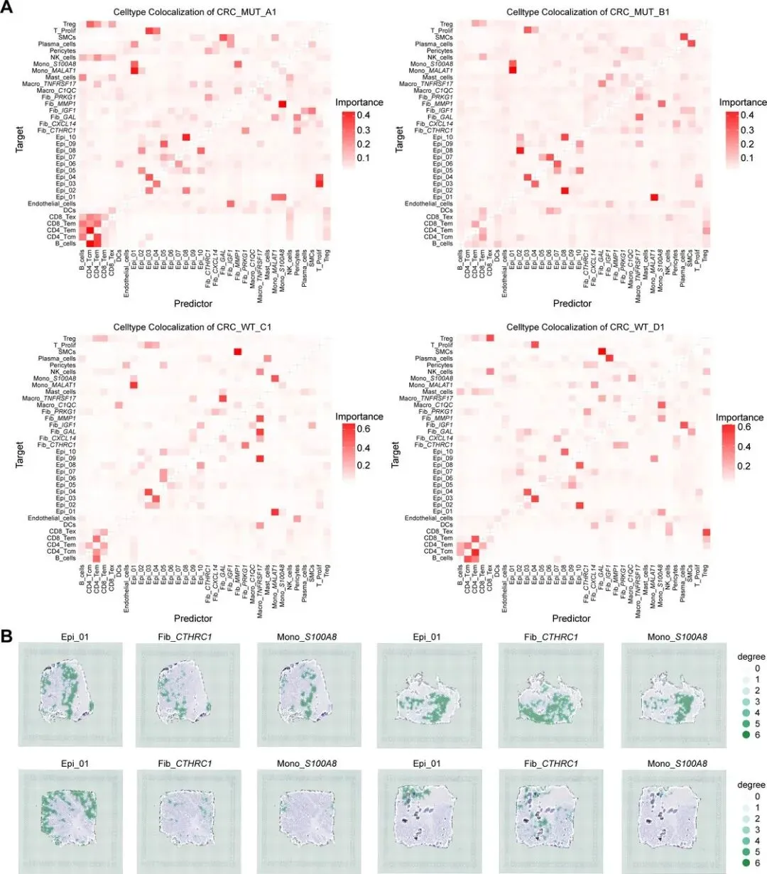 构建 KRASG12D/+; Villin-Cre 小鼠模型并建立 AOM/DSS 诱导结直肠癌模型,发现该模型小鼠肿瘤负荷更高、结肠更短、大肿瘤更多,肠上皮细胞中 KRASG12D 激活可促进癌症进展。对小鼠肿瘤组织 scRNA-seq 分析显示,其 TME 中成纤维细胞和髓系细胞比例显著升高,与人类 KRAS 突变 CRC 特征一致;成纤维细胞亚聚类后,KRAS 突变模型小鼠 Fib_CTHRC1 更丰富,髓系细胞亚聚类后 Mono_S100A8 比例和数量均增加。CellChat 分析证实,模型小鼠中 Fib_CTHRC1、Mono_S100A8 与 KRAS 突变上皮细胞间配体 - 受体信号显著增强,且存在与人类一致的 MDK-SDC4、COL1A1/COL1A2-ITGA2/ITGB1 信号轴,表明二者是促肿瘤生态位的关键功能成分,并非仅为生物标志物。对 3 例 KRAS 野生型和 3 例突变型 CRC 组织进行 mIHC 检测,以 CEACAM1(Epi_01 特异标志物)、EPCAM、CTHRC1、S100A8 为靶点,发现突变型肿瘤中三者荧光强度更高且存在空间共定位(CEACAM1 与 S100A8 共分布,CTHRC1 部分共存或分布于边缘),ST 数据与 mIHC 结果一致。研究证实,KRAS 突变上皮细胞通过 MDK_SDC4 信号招募 Mono_S100A8,Fib_CTHRC1 分泌胶原蛋白既促进肿瘤侵袭,又形成物理屏障,三者协同构建突变型 CRC 特有的免疫抑制微环境。本研究通过单细胞与空间转录组的跨技术整合,首次揭开了 KRAS 突变结直肠癌免疫抑制微环境的空间架构和分子机制,定义了全新的 “细胞三联体” 生态位模式。这一发现不仅深化了我们对 KRAS 突变驱动肿瘤进展的理解,更提供了可转化的生物标志物和治疗靶点,为突破 KRAS 突变结直肠癌的治疗瓶颈开辟了新路径。