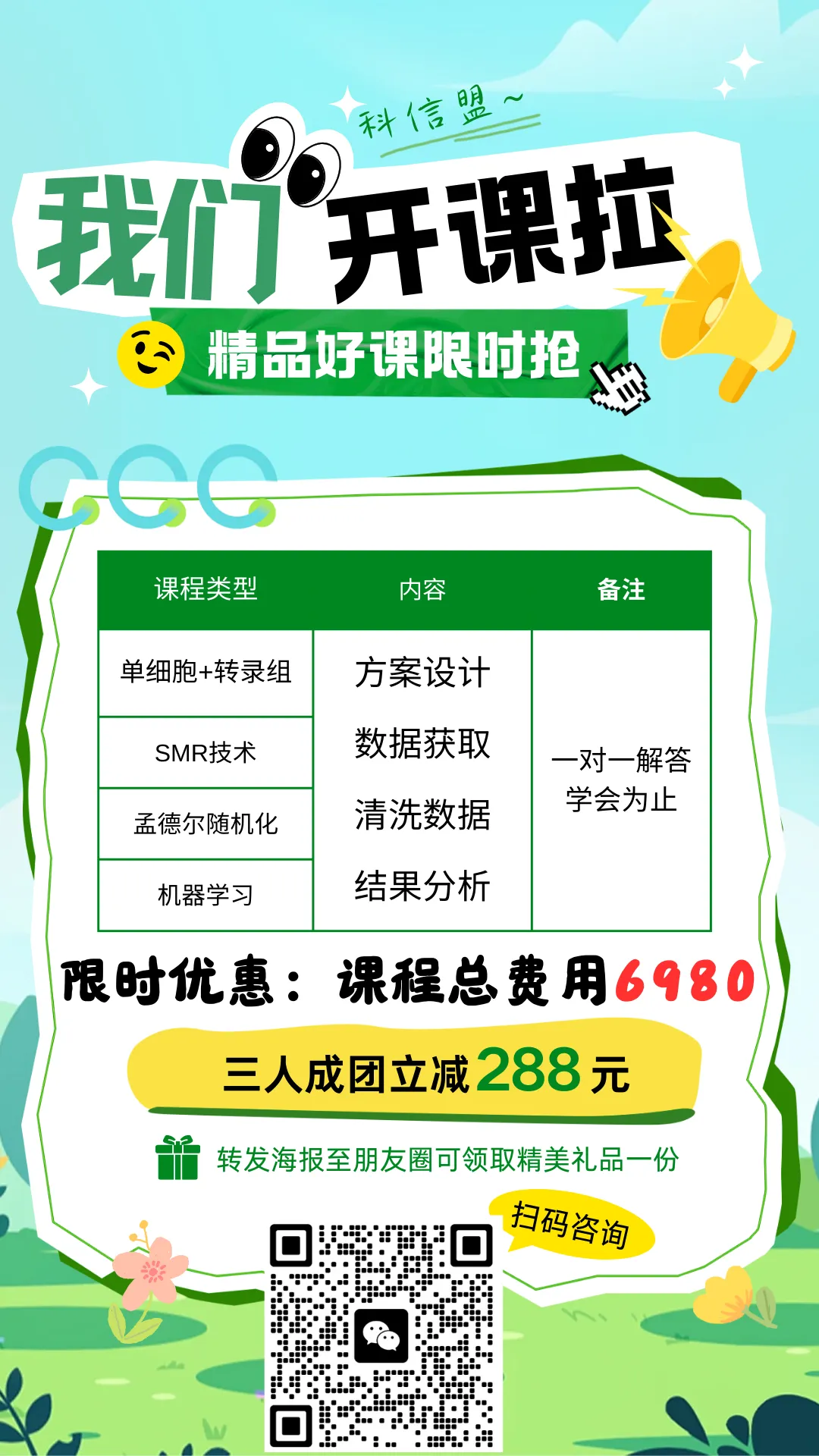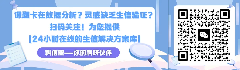 别让繁琐的数据分析拖慢科研进度!西安科信服生物的专业团队,懂你所需、解你所难:转录组、单细胞、肠道菌群…… 无论哪个领域,机器学习、孟德尔随机化等工具信手拈来。从数据到结论,从思路到成果,一站式服务让你专注科学本身。现在就联系我们,让你的科研之路少走弯路,快速产出高质量成果,离顶刊更近一步!单细胞、孟德尔、机器学习…技术更新太快学不动?自己摸索耗时易错?🔥 我们为你铺好最后一公里路!从方案设计、数据清洗到结果解析,核心技能一站配齐。不止教技术,更教你如何用在课题上。👉 专属福利:现在报名,享一对一导师全程答疑,真正“学会为止”!⏰ 限时叠加:三人拼团立减288元,转发海报再领神秘科研好礼!扫码咨询,让你的科研效率翻倍!