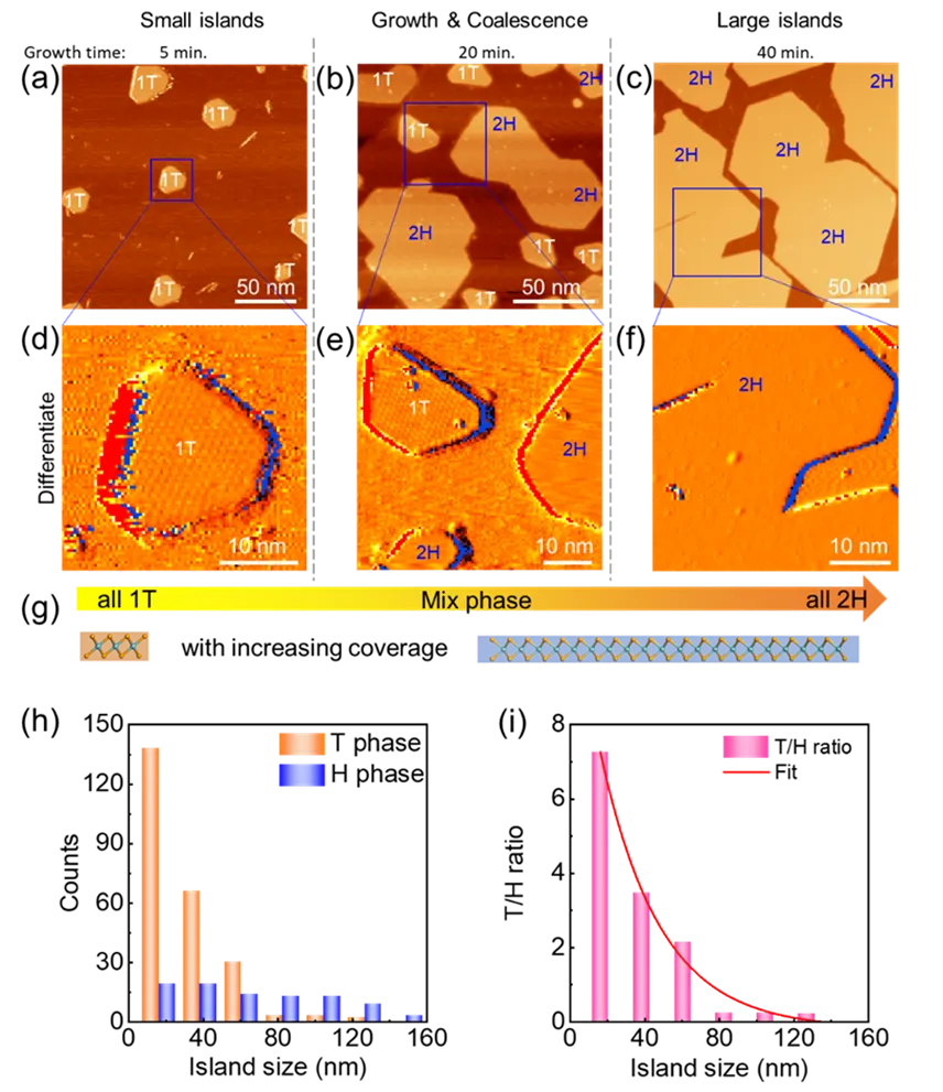 图2. 展示相变三阶段:成核(1T) → 合并(1T→2H) → 大岛(2H),通过统计曲线量化尺寸与相比例的关系。