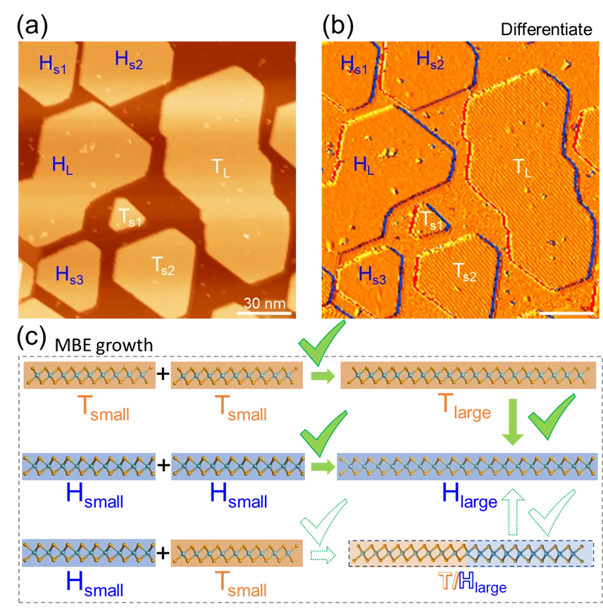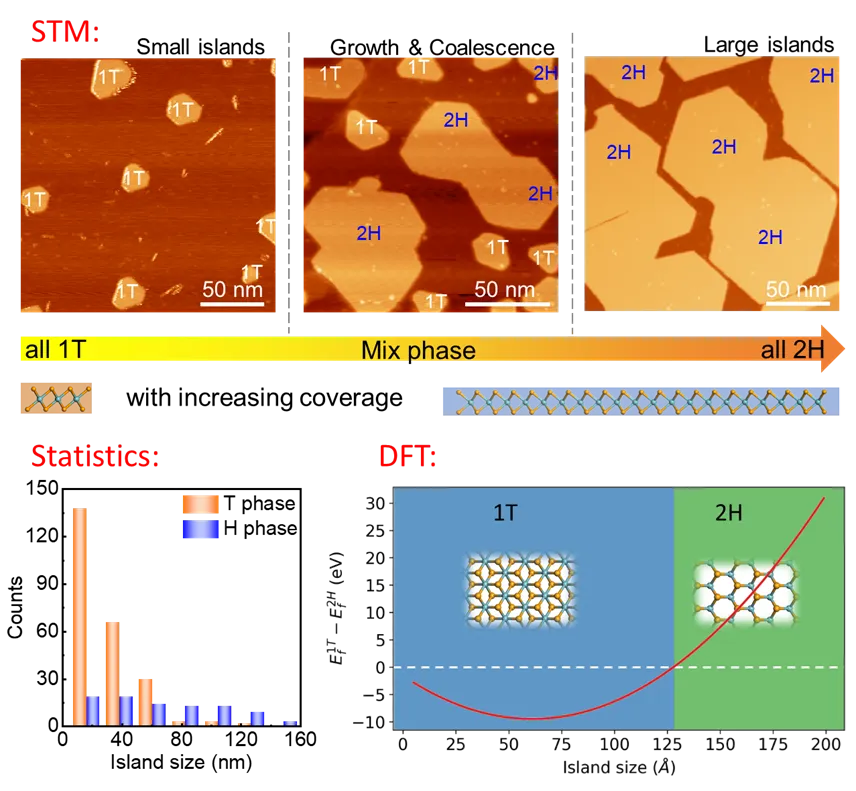 研究发现:在此研究中,团队通过扫描隧道显微镜(STM)直接观测到:在固定高衬底温度(550℃)下,SL NbSe2的相变完全由 “岛尺寸” 决定,而非传统认知的纯由衬底温度调控,具体经历三阶段生长:阶段1(成核期):覆盖度低时,形成的均为1T相小岛;阶段2(合并期):小岛逐渐生长、融合,当尺寸超过 “临界值” 后,自发转变为2H相;阶段3(大岛期):覆盖度足够高时,所有岛均转变为边界平整的2H相大岛。值得注意的是:高温生长条件下,小岛拼接之后形成的大岛,在拼接处是无缝连接没有畴界,为大面积wafer的均匀生长提供了关键的有利条件。