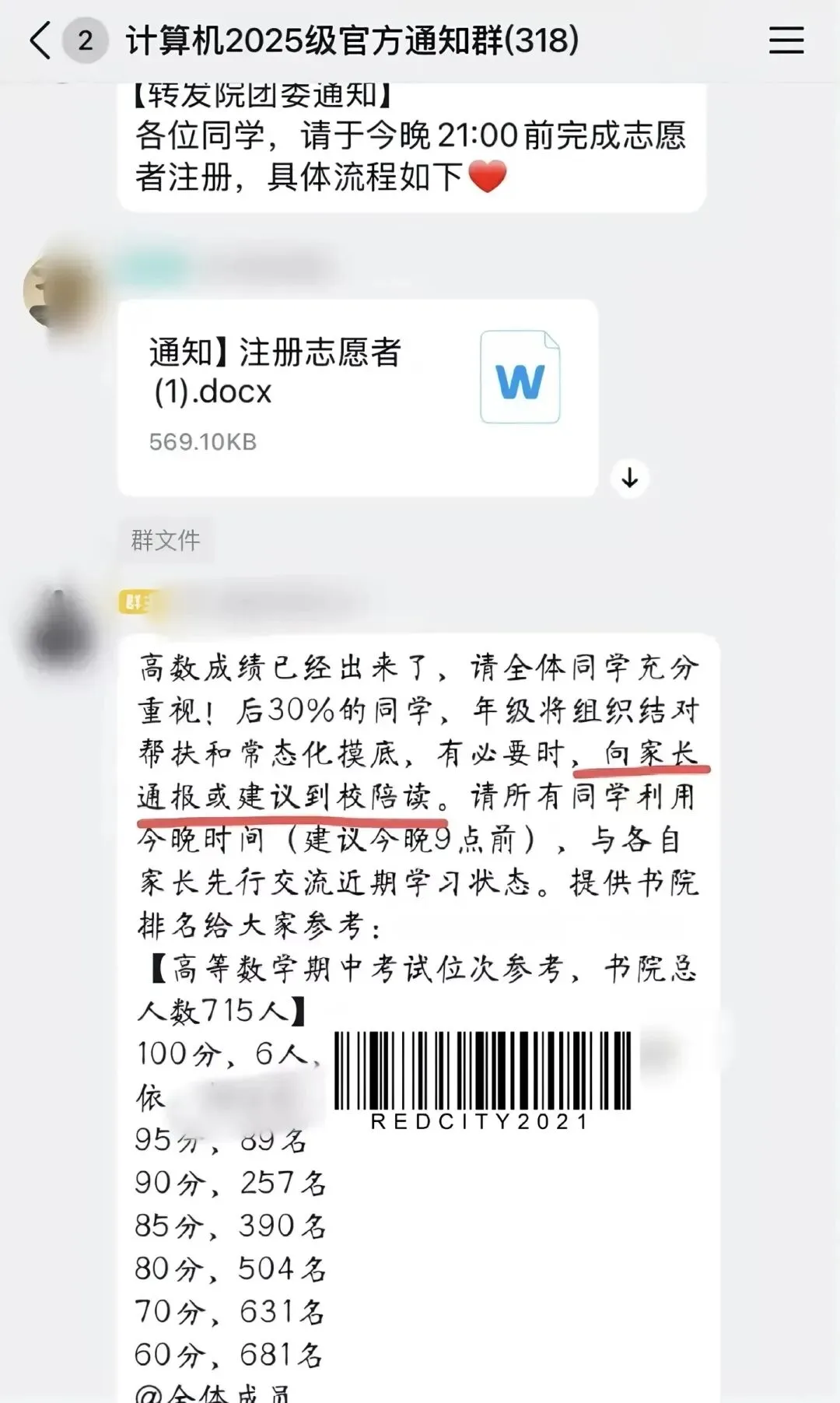 通知提出,高数成绩现已公布,排名后30%的同学,年级将组织结对帮扶与常态化摸底,“必要时会向家长通报,或建议到校陪读”。
