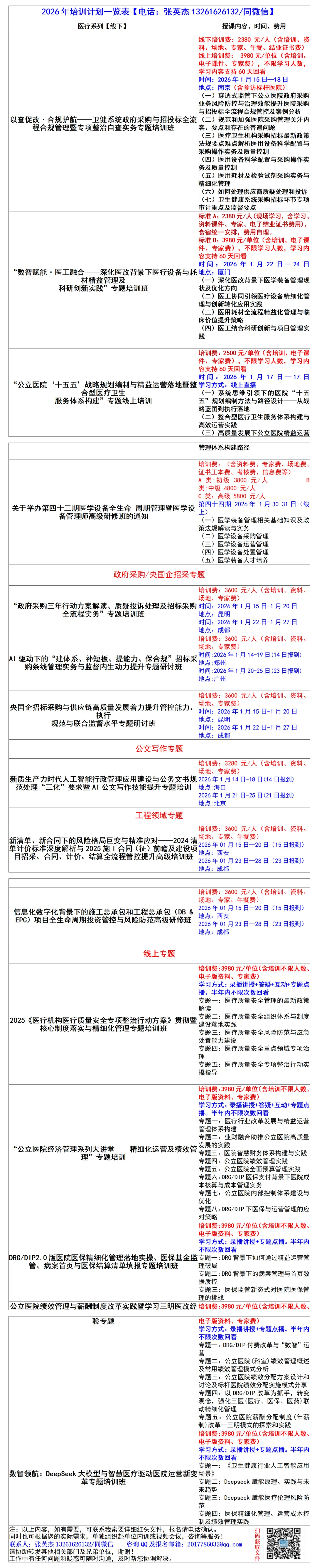 B:线上培训费3980元/单位(含培训、电子课件、专家费)不限学习人数,学习内容支持60天回看。(一)穿透式监管下公立医院政府采购业务风险防控与治理效能提升1.财政部2025年政府采购“四类”违法违规专项整治(财库〔2025〕14号)深度解读:政策出台背景与监管目标、“四类”违规行为(规避采购、虚假采购等)界定标准、典型违规案例(如拆分项目规避公开招标)剖析、多部门协同监管流程与医院内部管理机制搭建;2.政府采购八种法定方式实操与效能提升:每种方式(公开招标、竞争性谈判等)适用场景、流程步骤(如公开招标公告发布要求、竞争性磋商评审要点)、常见操作误区、效能优化路径(如简化非必要流程、提高采购效率);3.政府采购与招标投标核心边界厘清:两者法律依据差异、适用范围界定(如工程采购中采购与招标的适用场景)、关键环节(如招标文件编制、评标标准设定)本质区别、实践中易混淆问题解析;4.公立医院百万元以上大型设备全流程论证规范:论证重点(设备必要性、技术参数合理性、预算匹配度)、关键要素(临床需求、维护成本、使用效率)、论证流程(申请、调研、评审、审批)、审核核心指标(如设备性价比、供应商资质)与要求;5.政府采购合同全生命周期风险防控:签订阶段(合同条款合规性、权责明确性)要点与防控;履行阶段(履约进度跟踪、质量验收)管理与风险应对;变更(条款变更审批)与终止(终止条件合规性)规范与防范措施;6.公立医院基建及修缮工程采购与审计:基建/ 大修 / 装修改造工程适用采购方式(公开招标、竞争性谈判等)精准适配、不同工程类型采购流程差异、审计常见问题(如工程变更未走审批、竣工结算超预算)剖析与整改;7.公立医院后勤管理典型案例分析:护工护理员(服务采购招标、服务质量监管)、保安(安保服务采购流程、履约评价)、杂品(采购验收标准、库存管理)、洗涤(洗涤服务质量把控、费用核算)、食堂(食材采购合规性、食品安全监管)、物业(物业服务范围界定、服务绩效评估)领域案例解析与管理优化。(二)医疗卫生机构采购招标最新政策法规要点难点解析1.《政府采购领域“整顿市场秩序、建设法规体系、促进产业发展”三年行动方案(2024—2026年)》解析;2.《关于完善医药集中带量采购和执行工作机制的通知》(医保发〔2024〕31号)结余留用政策、核心内容及创新举措解析;3.财政部《关于政府采购领域本国产品标准及实施政策有关事项的通知(征求意见稿)》解析;4.财政部《关于进一步提高政府采购透明度和采购效率相关事项的通知》(财办库〔2023〕243 号)解析;5.《2025年纠正医药购销领域和医疗服务中不正之风工作要点》解析;7.公立医院接受公益事业捐赠政策背景、规范流程、审计监督要点。1.医疗设备配置需求管理及流程:预算管理、院内论证、院外论证;2.医用设备采购方式选择、审批流程及重点握把及风险防范;3.医疗设备的维护保养与质量控制、风险评估、日常安全检查;(六)卫生健康系统采购招标环节专项审计重点及监督要点1.公立医院政府采购最新审计案例深度透视:巡视/ 巡查 / 中央资金 / 专项审计典型实例(如设备采购超预算、采购程序不合规)、违规行为(如围标串标、合同履行不到位)根源剖析、审计方法(大数据筛查、现场核查)与技术应用、针对性整改措施与长效预防经验;2.政府采购核查重点内容与应对、专项审计方法及常见审计问题处理办法;获取详细红头文件请联系张英杰13261626132/微信招标采购哪些事儿公众号的内容来自网络搜索的公开文字和图片,如果之前文案、图片和后续文案、图片内容存在侵权,请留言联系编辑团队会在第一时间删除。