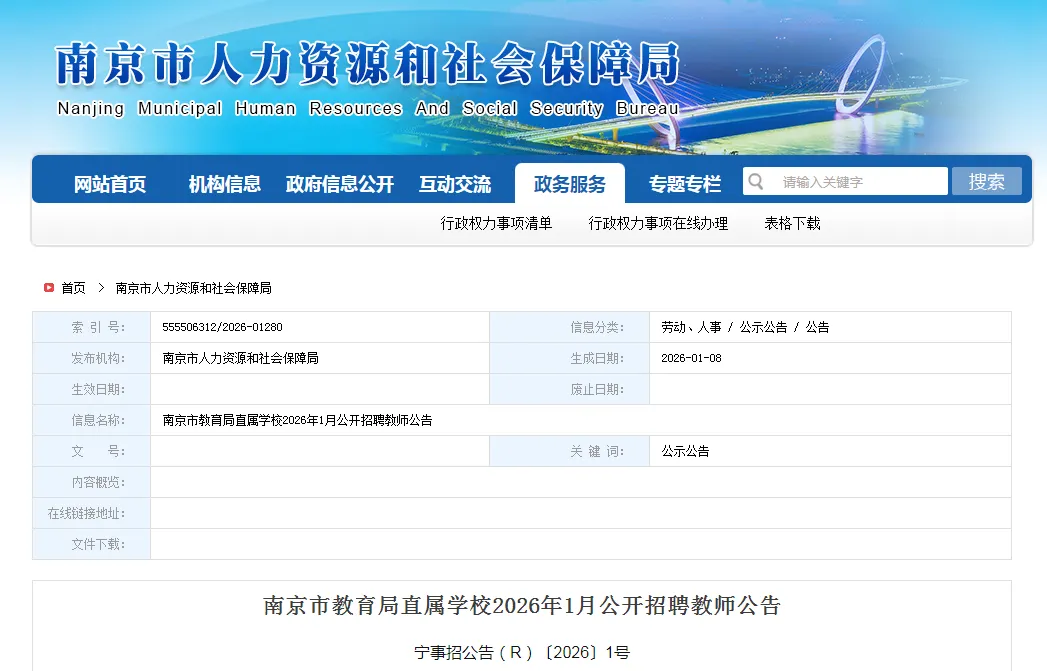 本次招聘相关信息在南京市人力资源和社会保障局网(http://rsj.nanjing.gov.cn)、南京市教育局网(http://edu.nanjing.gov.cn)公开发布。具体的招聘单位、招聘岗位及招聘条件等详见《南京市教育局直属学校2026年1月公开招聘教师岗位信息表1》(以下简称《岗位信息表1》)和《南京市教育局直属学校2026年1月公开招聘教师岗位信息表2》(以下简称《岗位信息表2》)。
